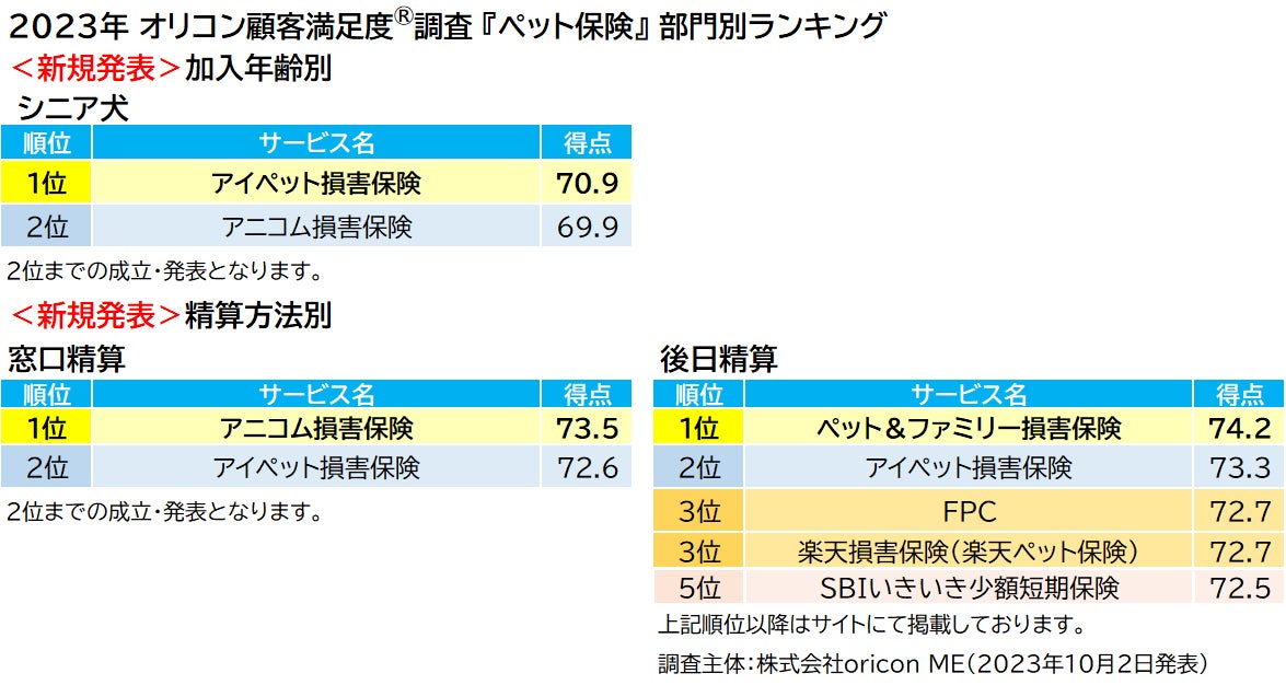 また今回から新たに3部門を新設しました。保険加入時に7歳以上の犬を飼っており、ペット保険を適用し、保険金を受け取った人を対象とする加入年齢別「シニア犬」部門では【アイペット損害保険(アイペット損害保険株式会社 本社:東京都江東区)https://www.ipet-ins.com/】が1位を獲得しました。