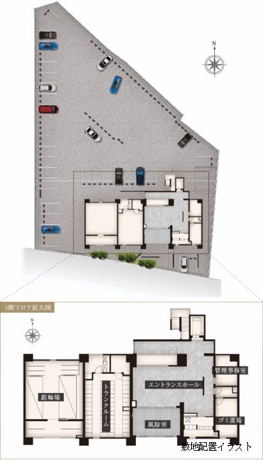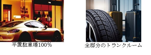 総戸数52邸に対して全邸分となる敷地内平置駐車場を完備。車高や重量制限も少なく、ワゴンやSUVなども駐輪可能です。また、冬用タイヤや大きな荷物を仕舞えるトランクルームも全邸分完備しています。