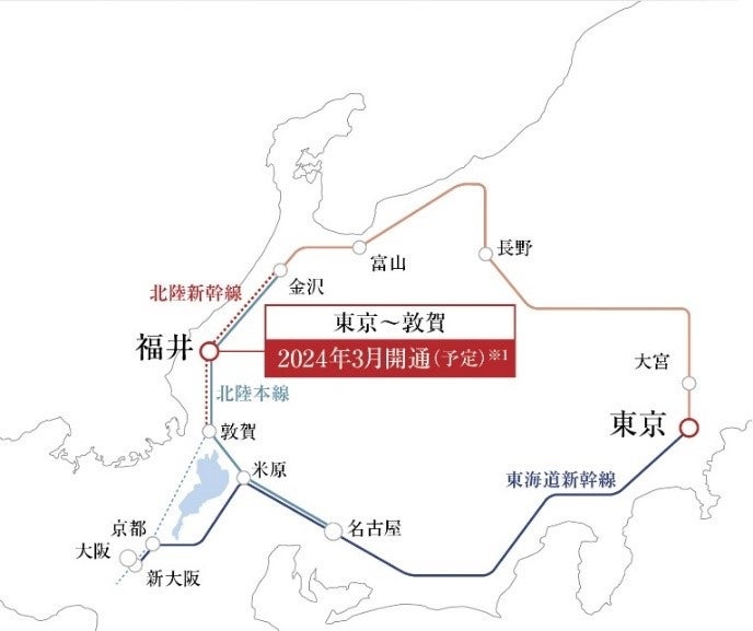 2024年3月、JR福井駅へ北陸新幹線が延伸開通(予定)します。東京駅へのアクセスが最大33分短縮され、乗り換えの必要もなく、最短2時間51分でアクセスが可能になります。首都東京とダイレクトに結ばれ、金沢、新高岡、富山などと新幹線で繋がることで、北陸エリアがより身近に。観光やビジネスの活性化が期待されます。