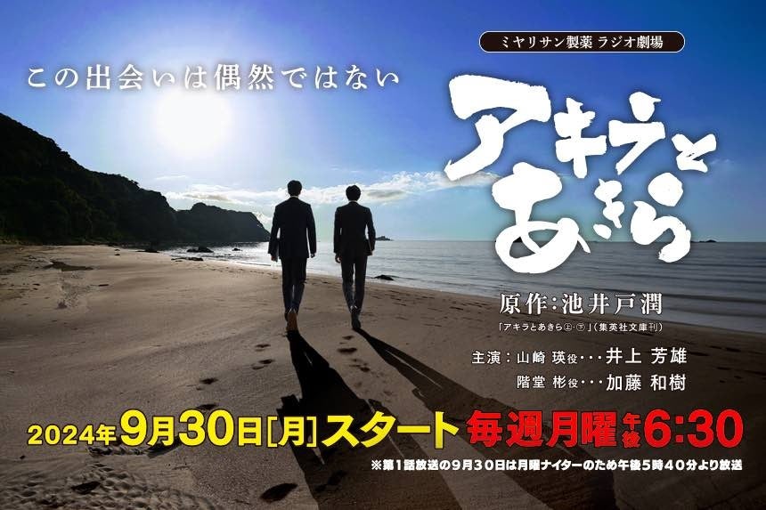 KBCラジオで放送予定の池井戸潤原作『アキラとあきら』が、10月よりaudiobook.jpでも配信決定!井上芳雄・加藤和樹がW主演で豪華音声ドラマに
