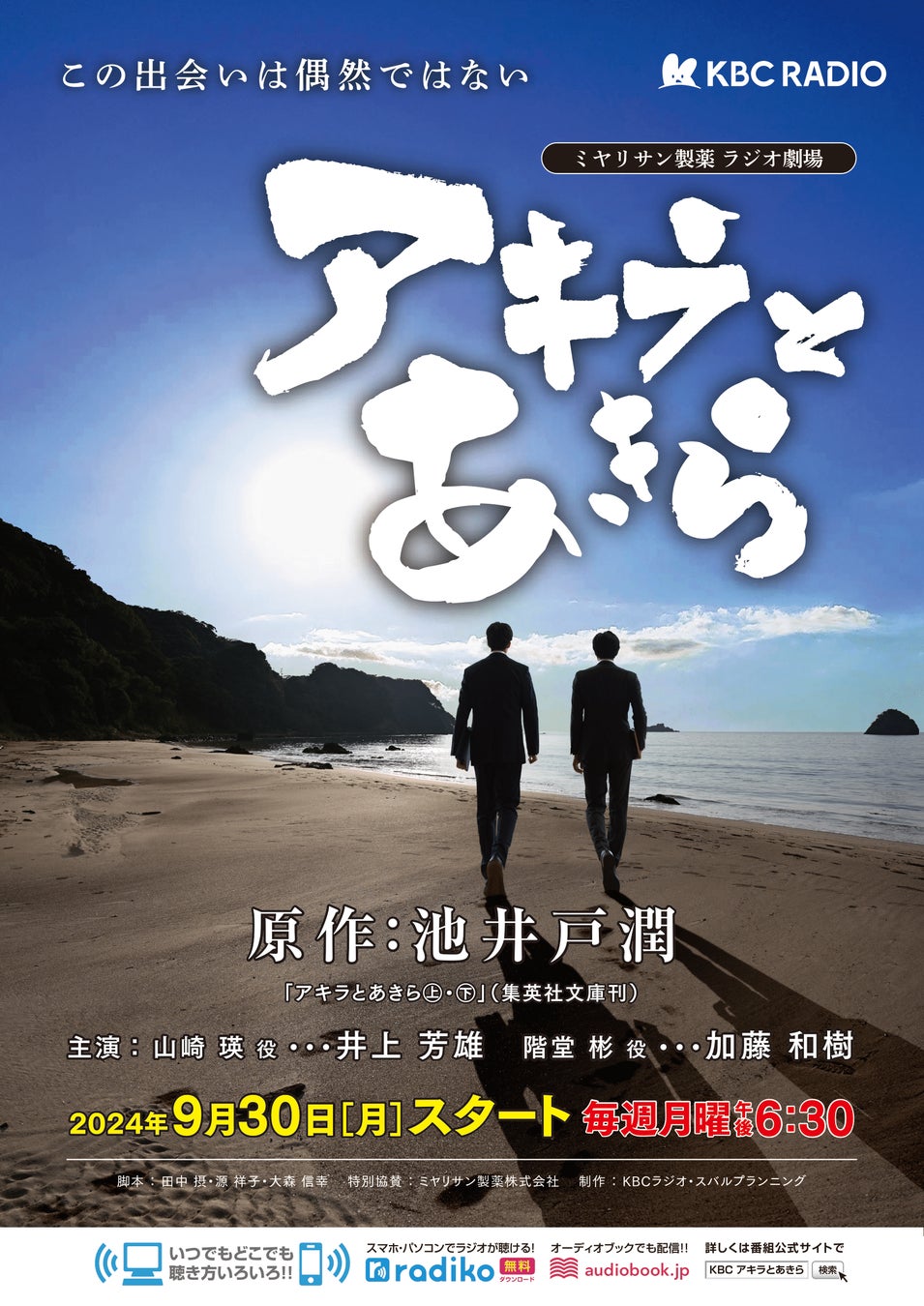 オーディオブック書籍ラインナップ数No.1(※1)の「audiobook.jp」を運営する株式会社オトバンク(本社:東京都文京区、代表取締役社長:久保田裕也、以下「オトバンク」)は、KBC九州朝日放送(通称「KBC」)が9月30日より放送を開始する池井戸潤氏原作の『アキラとあきら』を、10月7日よりaudiobook.jpにて配信することを決定しました。井上芳雄氏、加藤和樹氏のダブル主演で豪華音声ドラマ化される本作を、いつでもどこでも耳でお楽しみいただけます。※1. 日本マーケティングリサーチ機構2023年11月調べ。日本語オーディオブック書籍ラインナップ数調査。