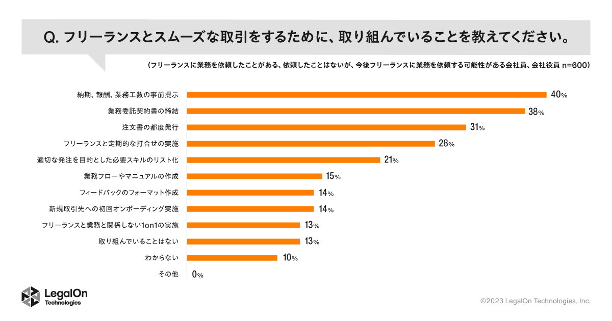 フリーランスとスムーズな取引をするために取り組んでいることの上位3つに「納期、報酬、業務工数の事前提示」(40%)、「業務委託契約書の締結」(38%)、「注文書の都度発行」(31%)となった。
