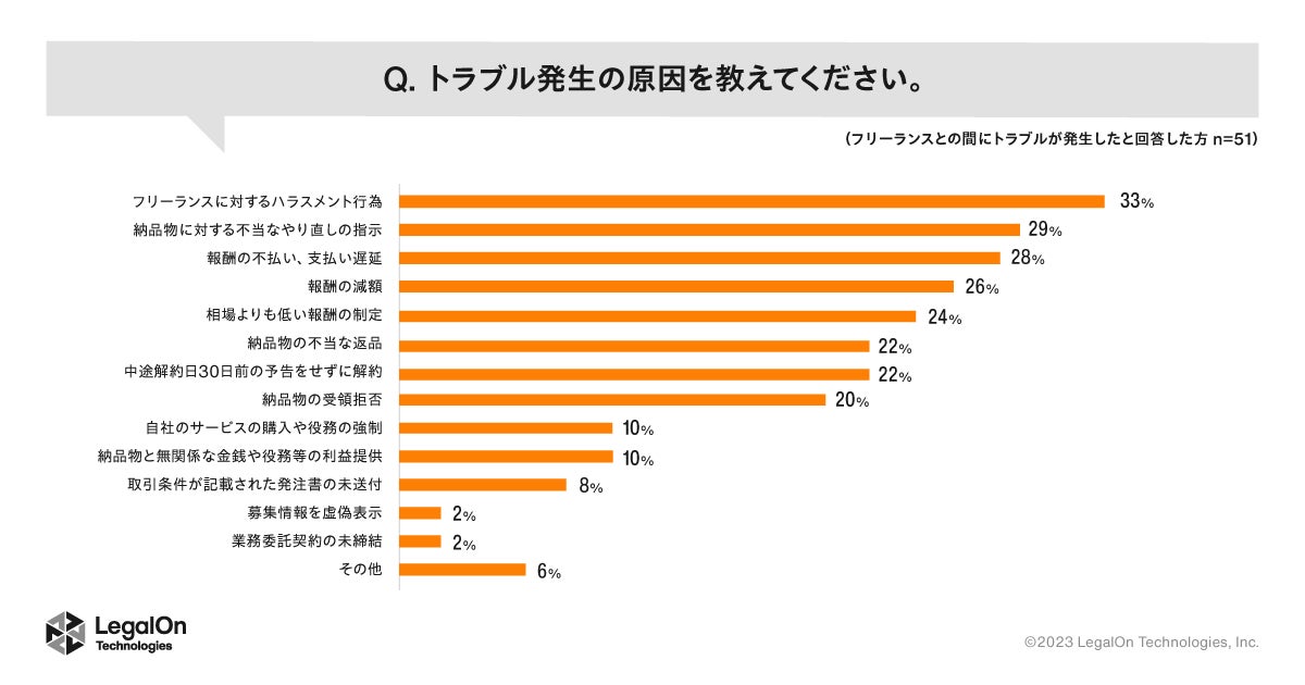 フリーランスに依頼をした本人や所属する会社とフリーランスとの間のトラブル発生の原因について、「フリーランスに対するハラスメント行為」(33%)がトップ。続いて「納品物に対する不当なやり直しの指示」(29%)、「報酬の不払い、支払い遅延」(28%)が挙げられた。