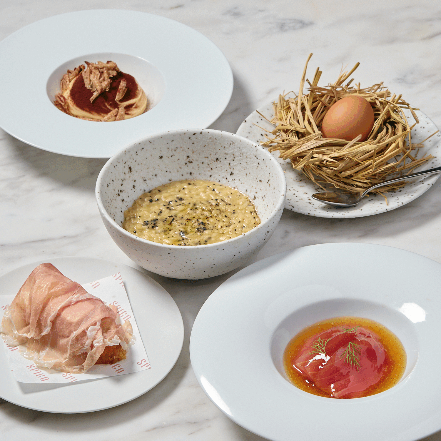 甲殻類の殻から抽出した濃厚な出汁で炊き上げた、SPICAの代名詞。パルミジャーノの塩気と甘海老の甘みが重なり合う、海の香りを存分に楽しめる一皿です。