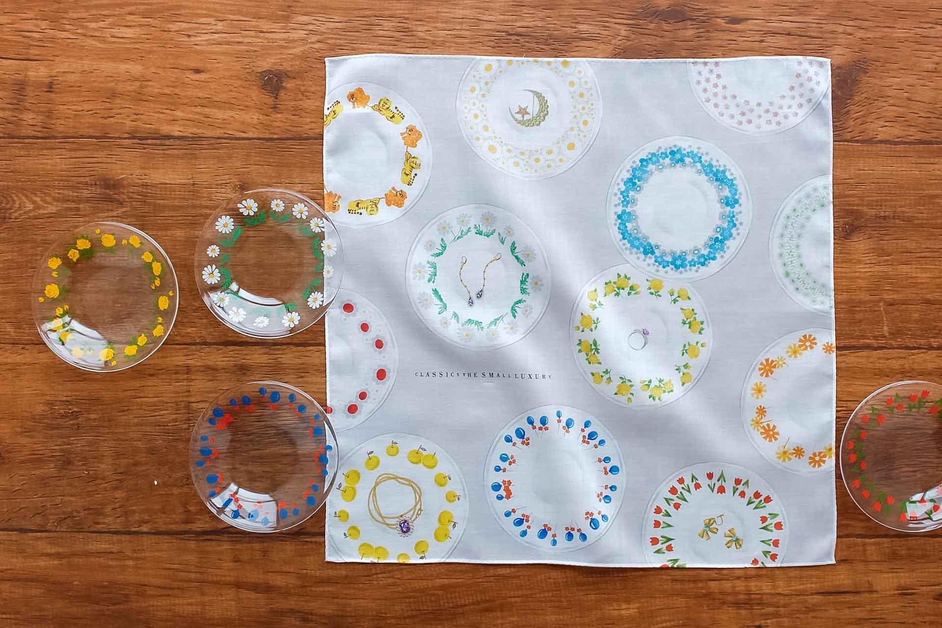 アデリアレトロの人気商品「プレート120」にアクセサリーをのせた様子を水彩タッチで描きました。アクセサリーは、クラシクス・ザ・スモールラグジュアリのこれまでのハンカチデザインで使われたきたものを使用しています。かわいらしさと大人のラグジュアリーさをバランス良く落とし込んだ一枚です。
