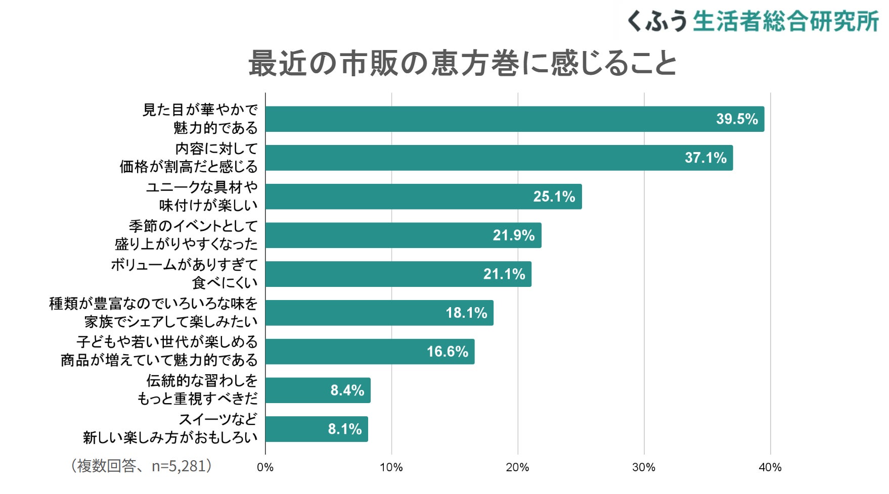 最近の市販の恵方巻については「見た目が華やかで魅力的である」(39.5%)と回答した人がもっとも多い結果となりました。「季節のイベントとして盛り上がりやすくなった」(21.9%)と節分を象徴する食文化として受け入れられ、「ユニークな具材や味付けが楽しい」(25.1%)「種類が豊富なのでいろいろな味を家族でシェアして楽しみたい」(18.1%)と、その多様化を楽しむ人が多いことがわかります。