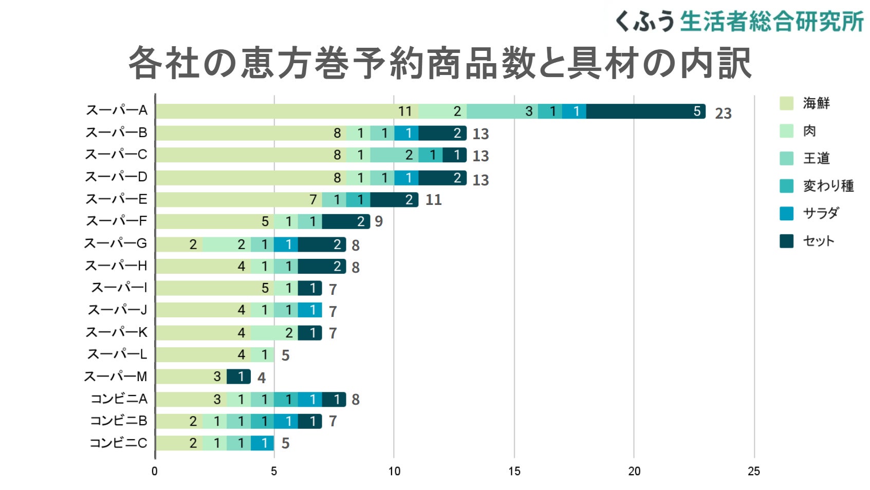 くふう総研は各社の公式ホームページ掲載の情報を元に、スーパー13社、コンビニ3社の2025年恵方巻商品(予約受付商品のみ※2)を調査しました。