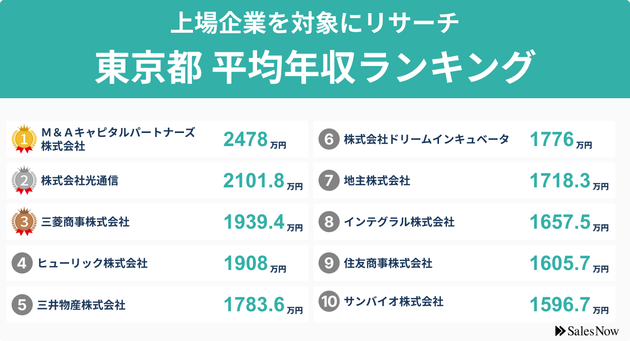 【東京都】上場企業平均年収ランキングTOP10!/SalesNow DBレポート