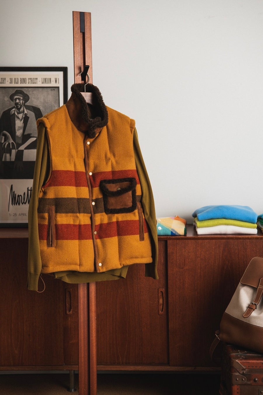 ブランケット柄のパネルボーダーをラムウール50% シェットランドウール50%の糸で作り強縮絨仕上げを施した生地を使用したダウンベスト。 襟、パッチポケットには柔らかなムートンを使用するなど、ラグジュアリーな素材の組み合わせです。 表生地と裏地の間にはダウン90%フェザー10%を入れ、防寒性をアップ。 型はジャケットやブルゾン、コートの上からも着用可能なようにややゆとりを持たせたベスト。ファッションアイテムとしても、防寒着としてもレイヤードスタイルを楽しめる1着です。