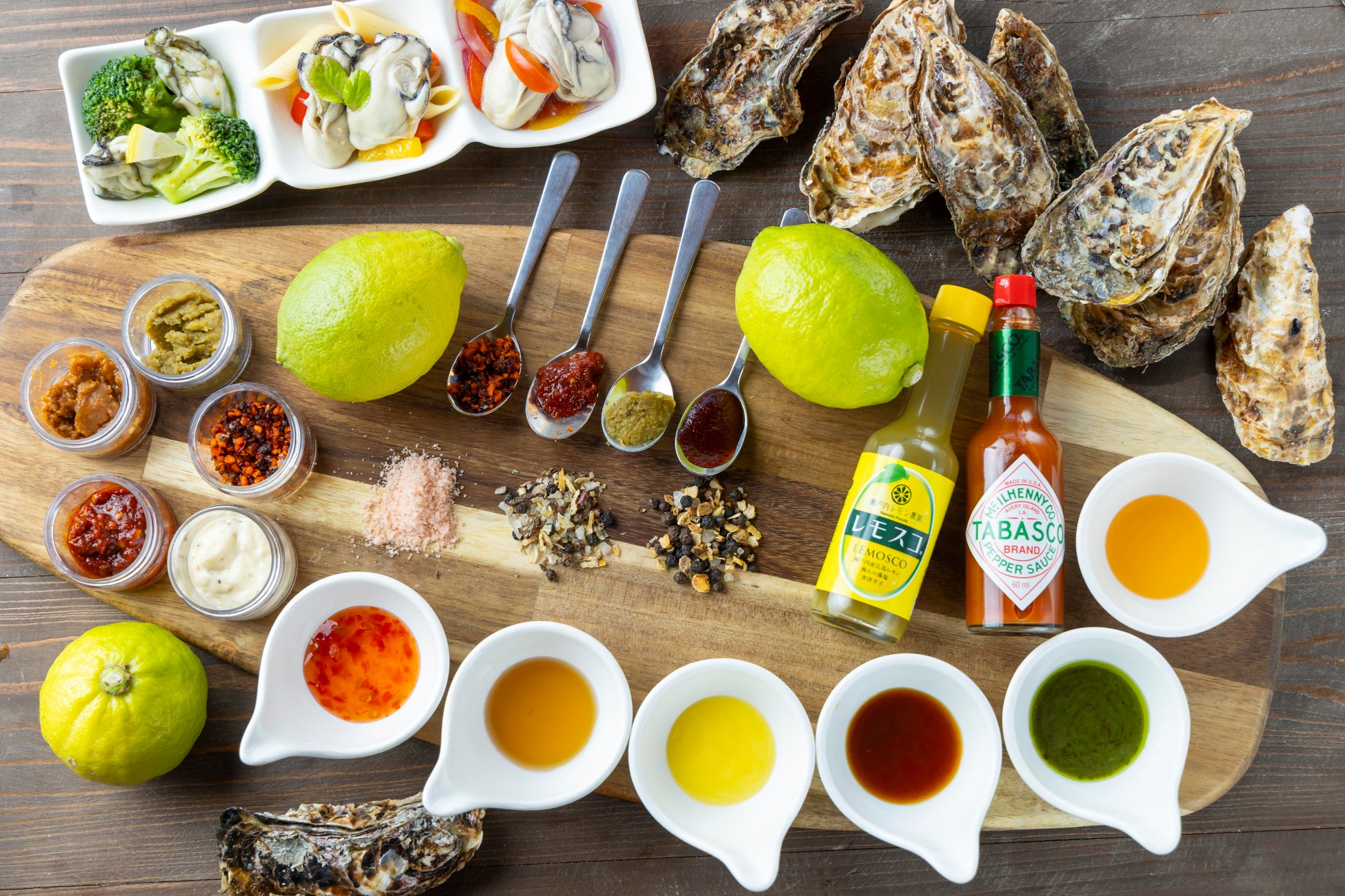 そこでセトリーニでは、「手ぶらで気軽に。そして自由に牡蠣を楽しんでほしい」という想いから ご用意した20種の調味料からお好みの味を見つけて楽しんで頂く牡蠣プランが誕生しました。