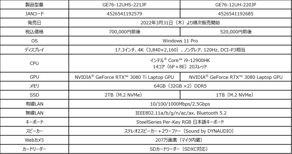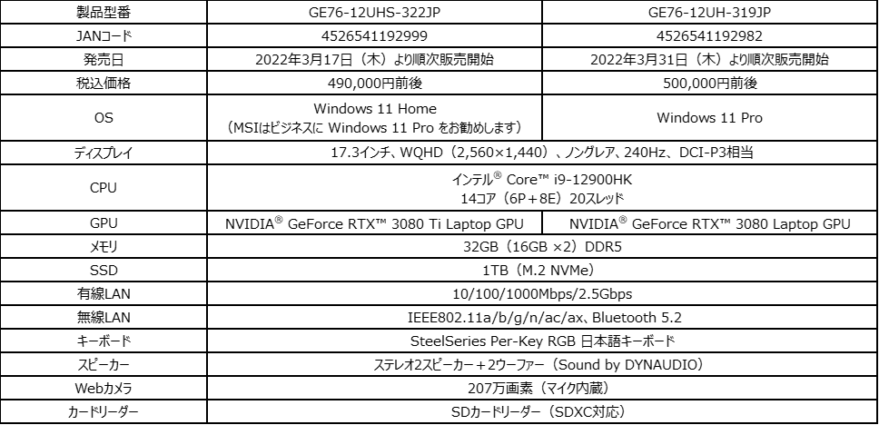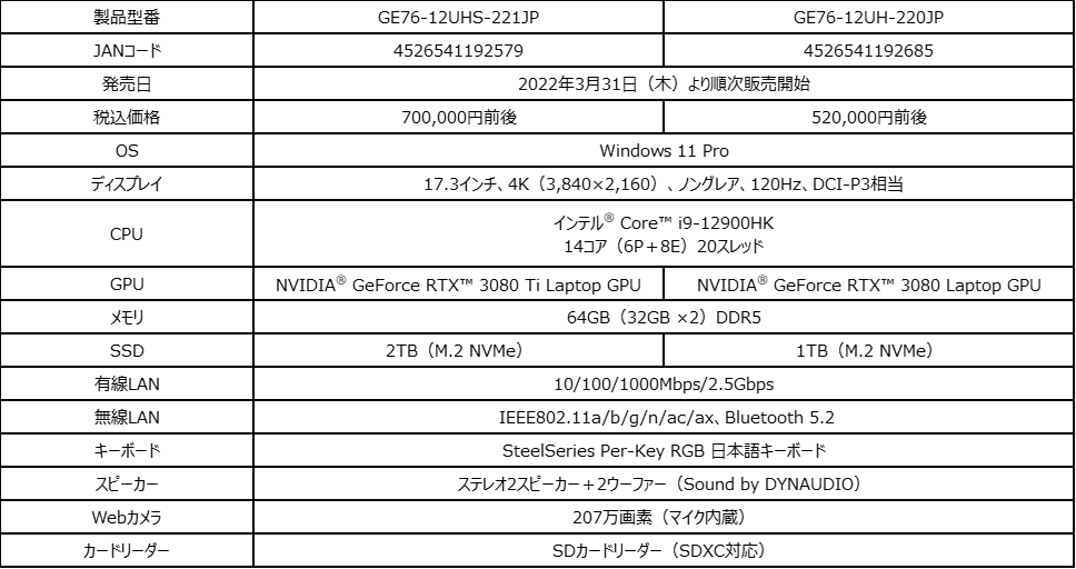 この度、エムエスアイコンピュータージャパン株式会社は、ハイブリッドコアアーキテクチャを採用した『第12世代インテル® Core™ プロセッサー』の最上位モデル「Core™ i9-12900HK」に加え、ノートPC向け『GeForce RTX™ 30 シリーズ グラフィックス』の最上位モデル「GeForce RTX™ 3080 Ti Laptop GPU」と「高リフレッシュレートゲーミング液晶パネル」を搭載したウルトラハイエンドゲーミングノートPC『Raider GE76 12U』シリーズのバリエーションモデルを2022年3月17日(木)より順次販売開始いたします。