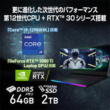 ●4Kゲーミング・クリエイティブを追求したウルトラハイエンド構成等を追加『Raider GE76 12U』シリーズのバリエーションモデルとなる「GE76-12UHS-221JP」と「GE76-12UH-220JP」は、4Kゲーミングとクリエイティブを追求したウルトラハイエンド構成を採用。CPUには『第12世代インテル® Core™ プロセッサー』シリーズの最上位モデル「Core™ i9-12900HK」を搭載し、マルチタスク・ゲーミング・クリエイティブにおける処理性能をハイエンドデスクトップPCレベルにまで引き上げています。「GE76-12UHS-221JP」では、グラフィックス機能にノートPC向け『GeForce RTX™ 30 シリーズ』の最上位モデル「GeForce RTX™ 3080 Ti / 3080 Laptop GPU」を搭載。PCゲームを4K解像度に加え、高画質設定の美しい映像表示でも安定したゲーム内フレームレートを実現し、今までにないほど4Kゲーミングを快適にお楽しみいただけます。