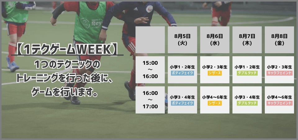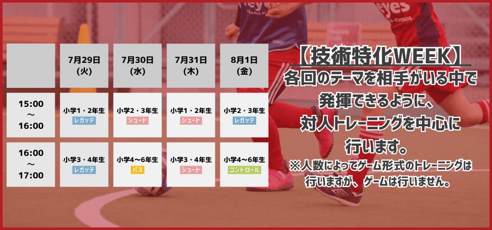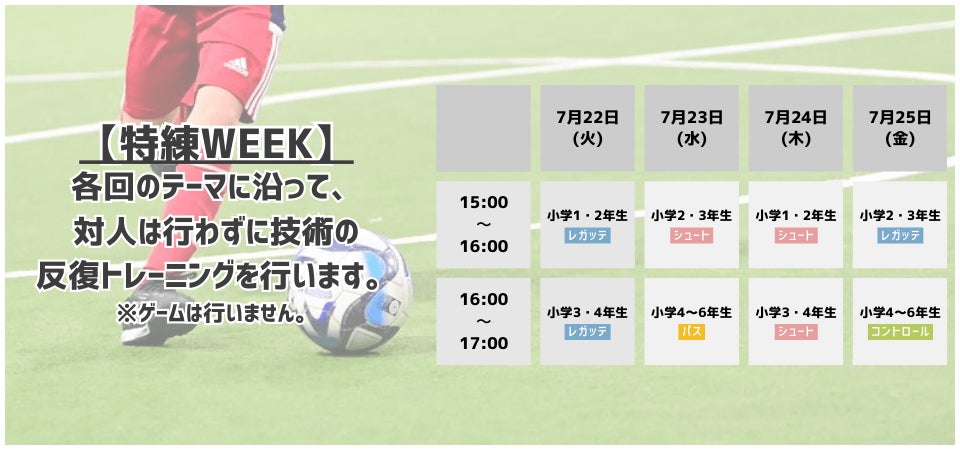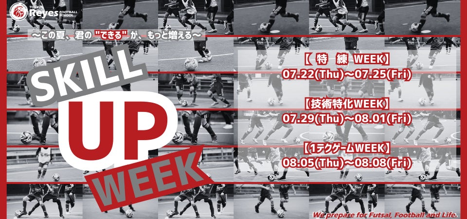東急Sレイエス フットボールスクール 池袋では、夏休みの期間にお子様の成長を後押しする集中トレーニングイベント『SKILL UP WEEK』を開催いたします。