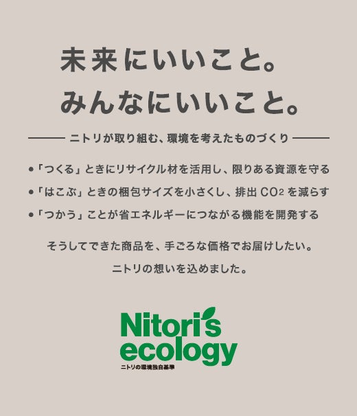 わたしたちニトリグループは、「未来にいいこと。みんなにいいこと。」のキャッチフレーズのもと、「つくる・ はこぶ・つかう」それぞれのフェーズで、環境に配慮したものづくりを「Nitori's ecology」と位置付け、サステナブルな取り組みを進めています。さらに「つかいおわったあと」までを考え、企画・設計段階から資源の有効活⽤を⾒据えた商品開発や、回収して資源にまわせる製品の拡⼤を⽬指しています。
