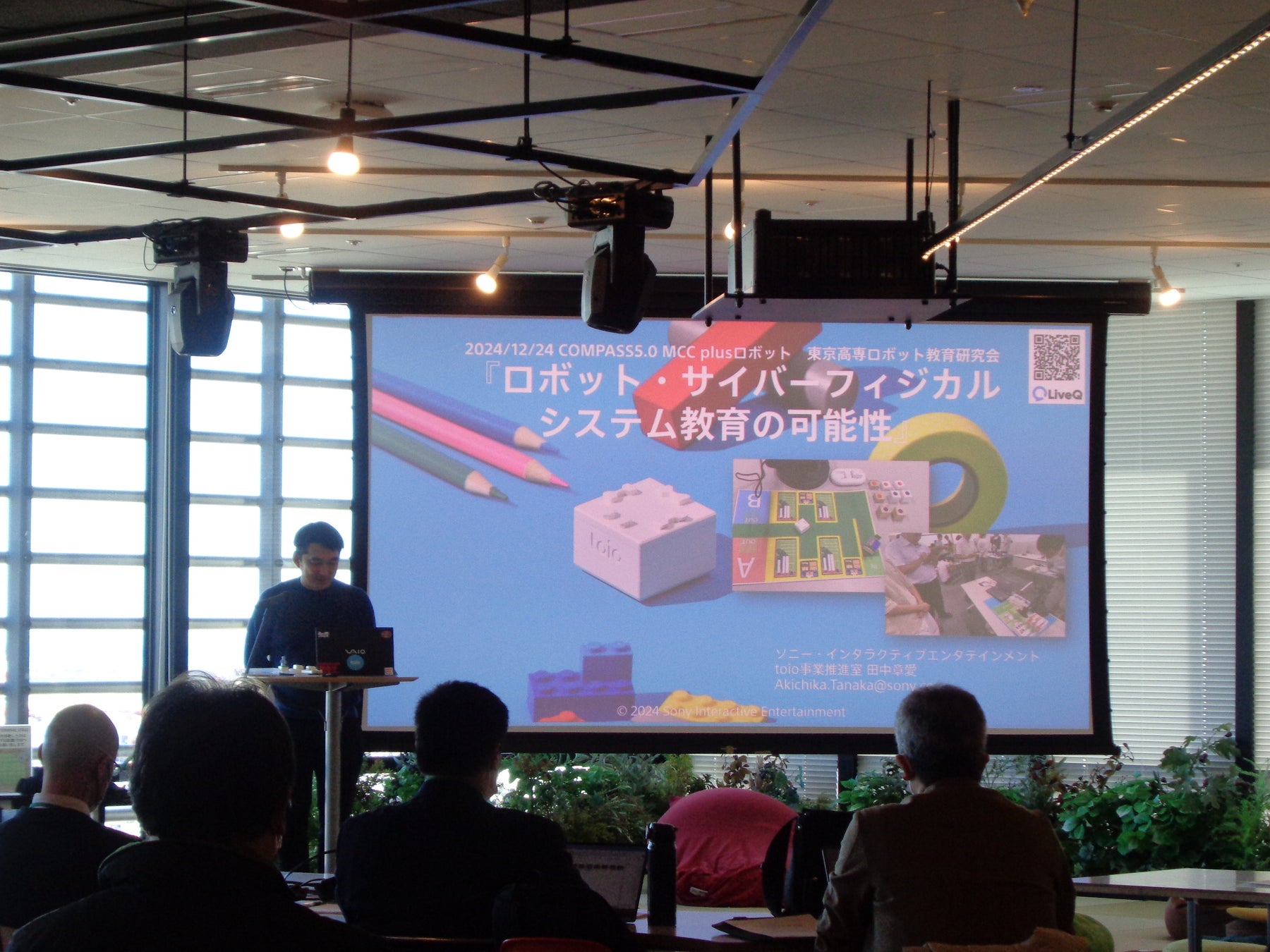 東京高専は2023年(令和5年)度より株式会社ソニー・インタラクティブエンタテインメント toio事業推進室シニアマネジャー田中章愛(たなかあきちか)氏の協力を仰ぎ、東京高専機械工学科准教授原口大輔が開発した教材のアップデートを進めています。当日は、「デジタルツインを活用した産学連携ロボットSIer教材の紹介」として事例も含めて田中氏と原口から説明を行いました。