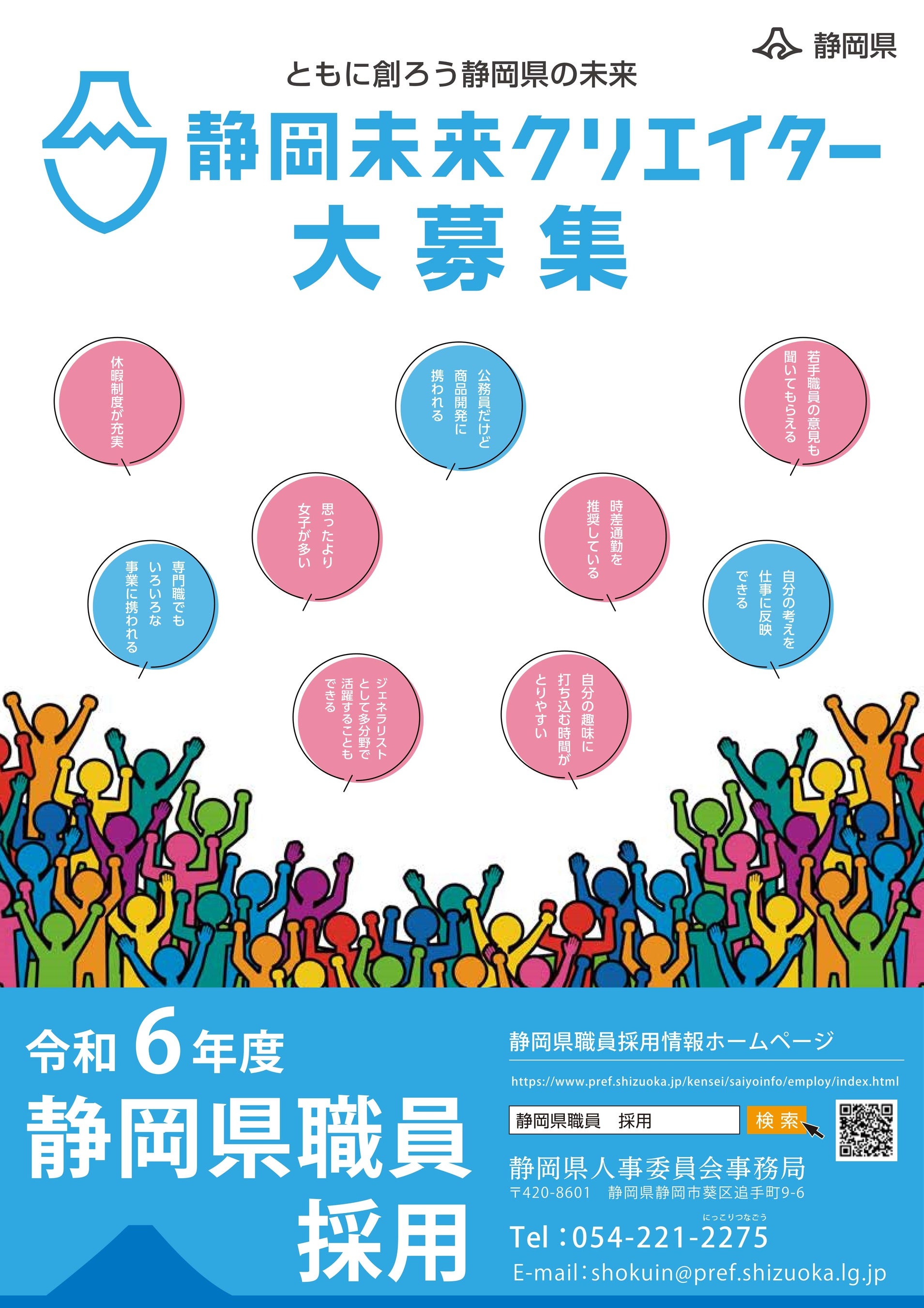 ・静岡県では、多様化、複雑化する行政ニーズに対応するため、様々な資質・能力を持った人材を求めています。魅力ある地域づくりや県民生活の安全安心を支える仕事を通じて、静岡県の未来を創る「静岡未来クリエイター」(県職員)を募集します。