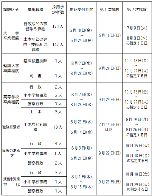 ・各試験の詳細内容は、静岡県職員採用情報のホームページに掲載されている「受験案内」を御確認ください。(https://www.pref.shizuoka.jp/kensei/saiyoinfo/employ/index.html)