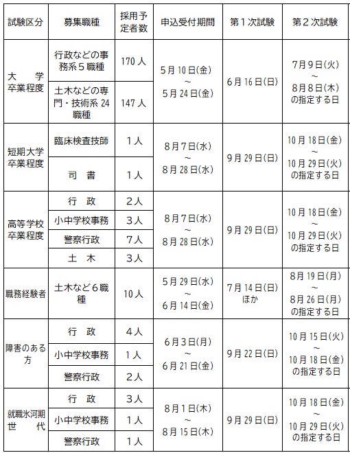 試験区分ごとの試験日程、募集職種、採用予定者数は、下記のとおりです。