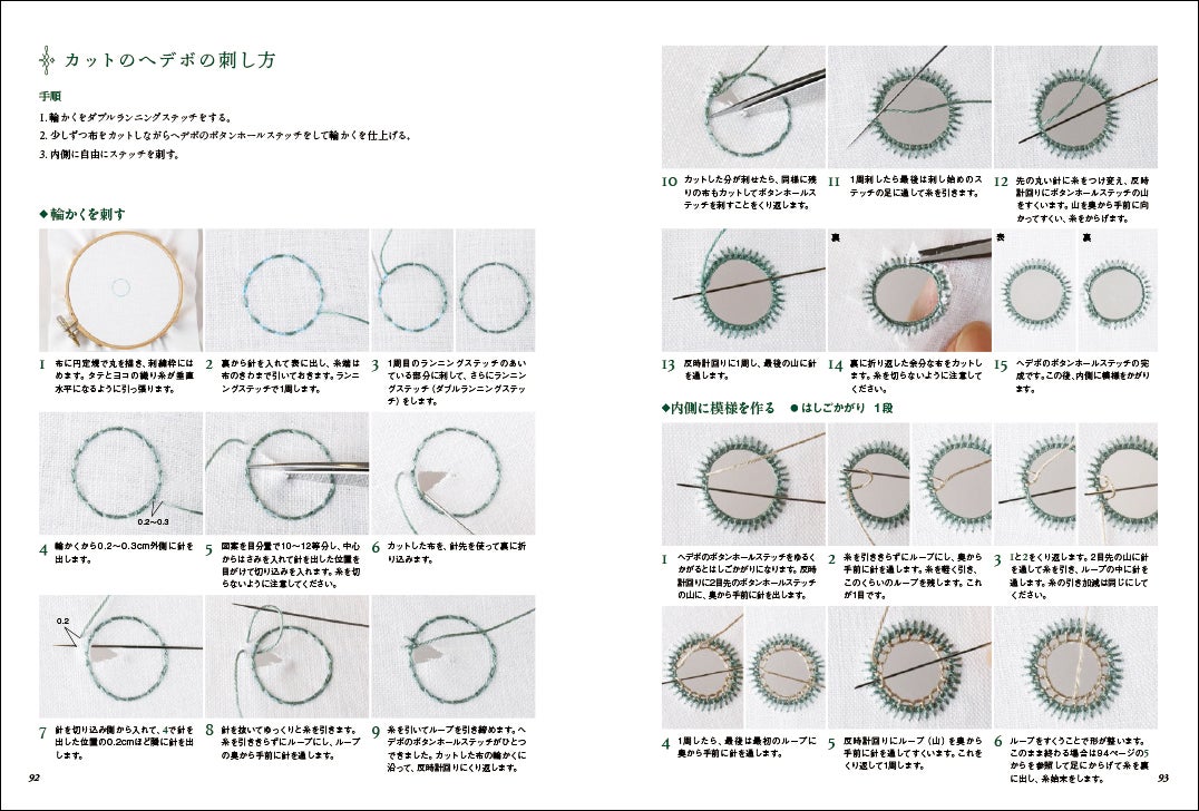 ◆カットのヘデボや、バルデュリングなどの刺し方の工程も、写真付きで解説しているので初心者でもわかりやすい