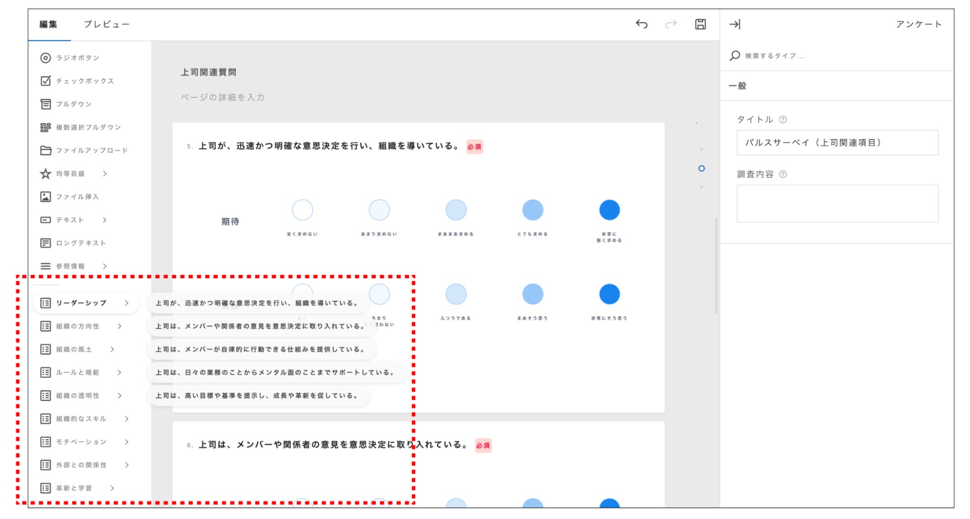 「組織診断パルス機能」は、これまで「センサス」でのみ利用可能だった設問項目を、人事担当者が任意に作成するサーベイでも一部設定できるようにした機能です。これにより、人事担当者はより高い頻度で、正確に組織の状態を把握することができます。