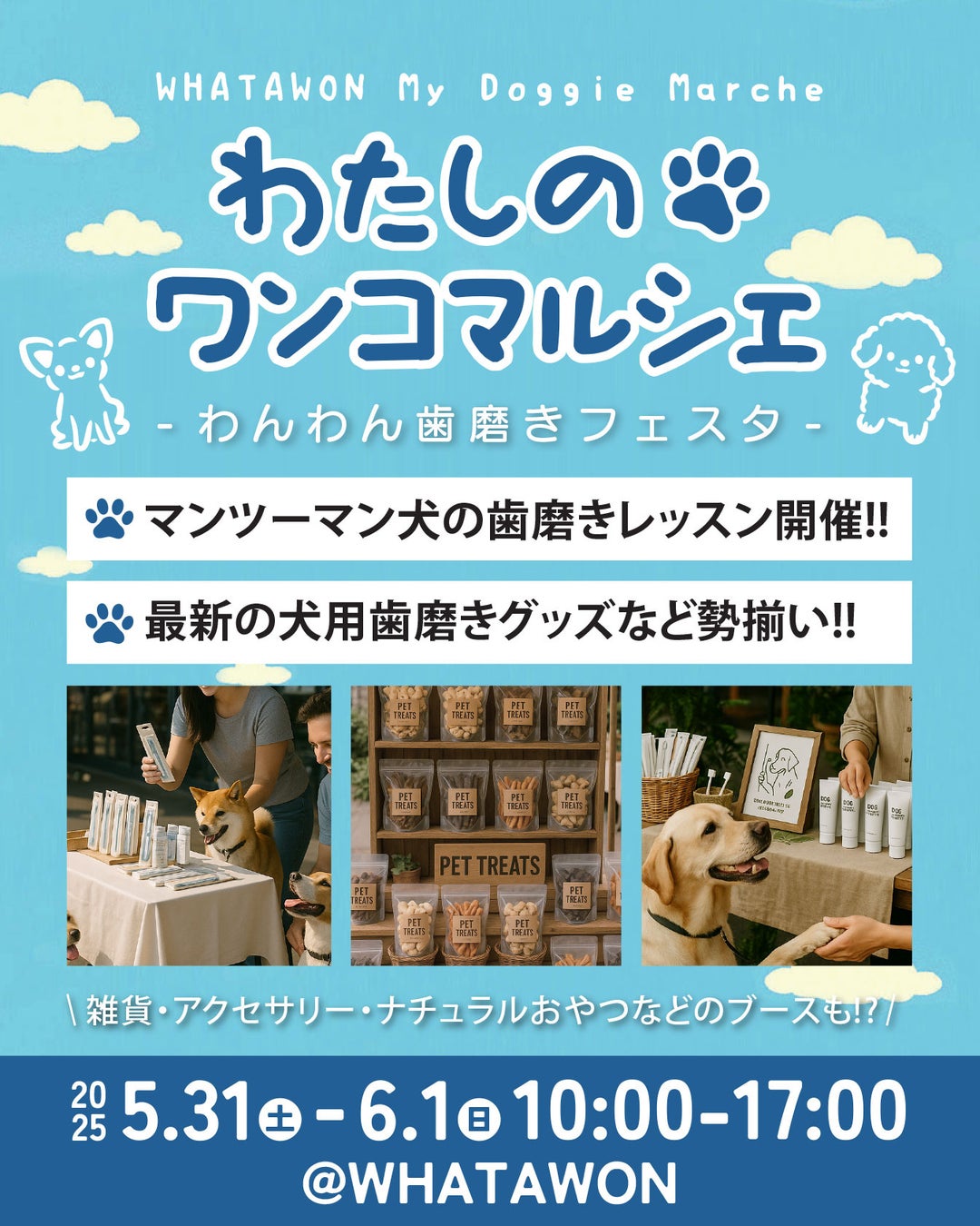 全国のわんちゃん好きに人気の南大阪WHATAWONで『わたしのワンコマルシェ – わんわん歯みがきフェスタ – 』第1回の開催が決定5/31(土)・6/1(日)|ケア&おやつが充実!