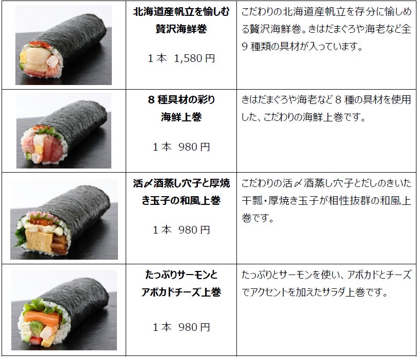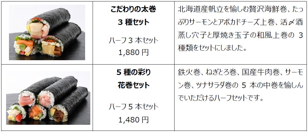 また今年は新たに、大好きなねたを存分に楽しみたい方に向けて、「北海道産帆立を愉しむ贅沢海鮮巻」や「たっぷりサーモンとアボカドチーズ上巻」なども取り揃えております。人気のハーフサイズのセットも充実させ、帆立・穴子・サーモンを愉しめる「こだわりの太巻3種セット」や「5種の彩り花巻セット」もラインナップ。ご家族でお好きな種類を分け合うなど、たくさんの種類を食べたい方におすすめです。対象商品は事前にインターネットでご予約いただきますと5%引になり、大変お得です。