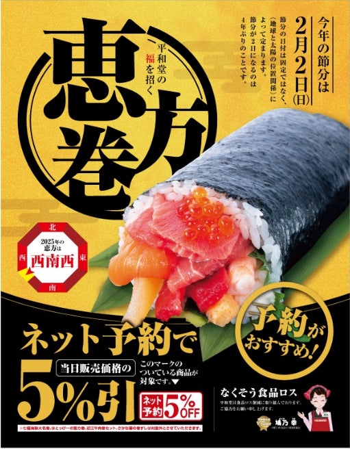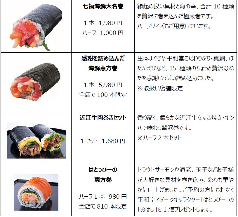 株式会社平和堂(本社:滋賀県彦根市、代表取締役社⻑執⾏役員CEO:平松正嗣)は、恵方巻の予約を平和堂・エール160店舗で承っております。