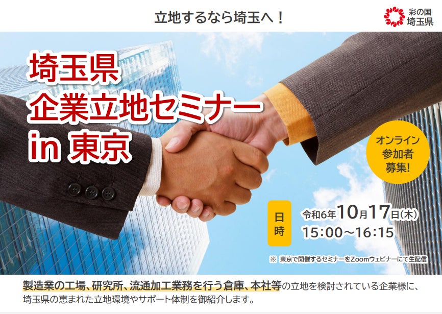 埼玉県への立地を検討されている企業の皆様に、首都圏の交通の要衝としての魅力など、埼玉県の恵まれた立地環境やサポート体制を御紹介するセミナーを開催します。