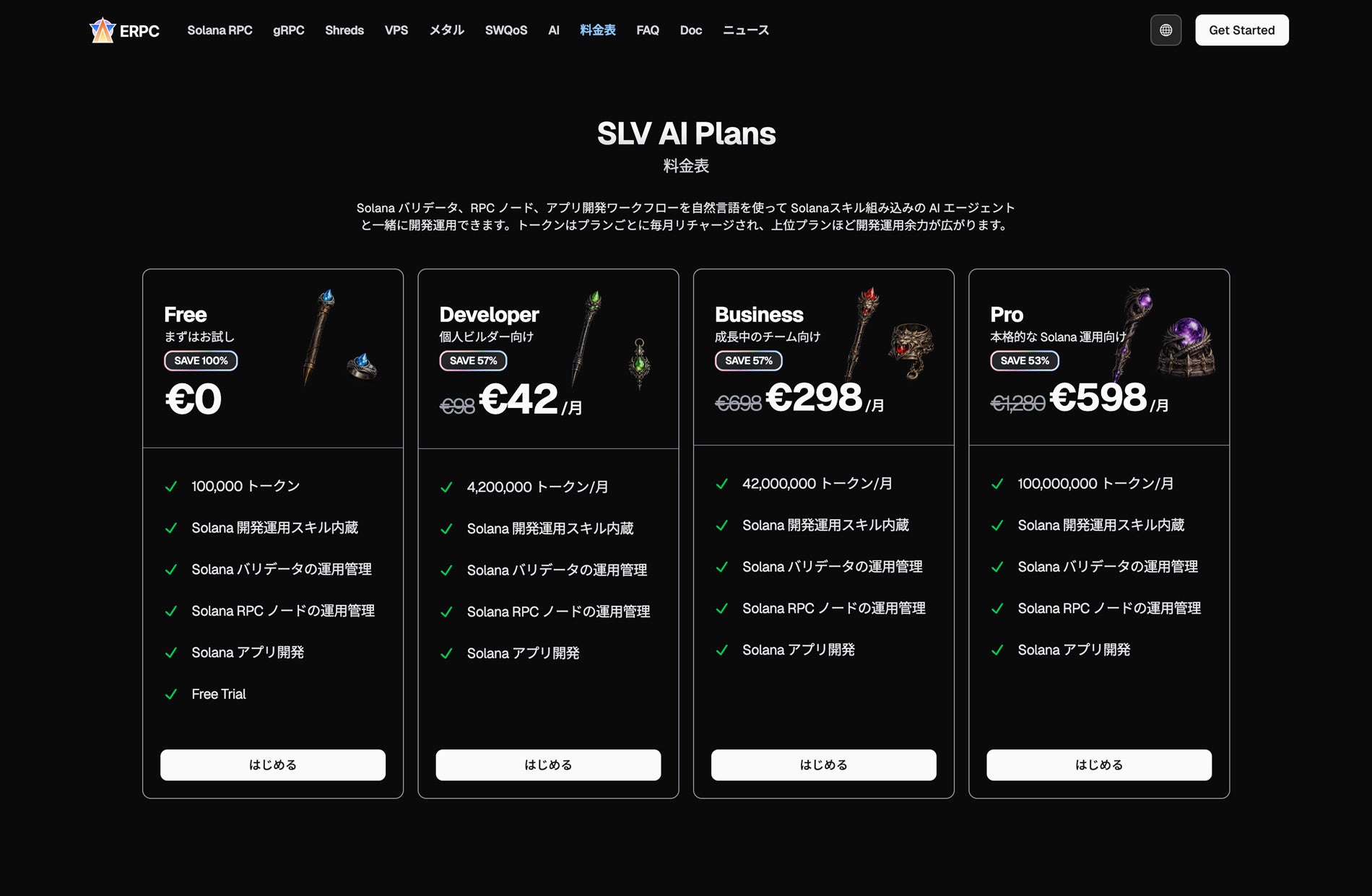Developer(€42/月) — 4,200,000 トークン/月。個人ビルダー向けのプランです。テストネットバリデータの運用を問題なく継続でき、Solana アプリ開発も開始できる容量です。SLV AI を本格的に使い始める最初の選択肢です。