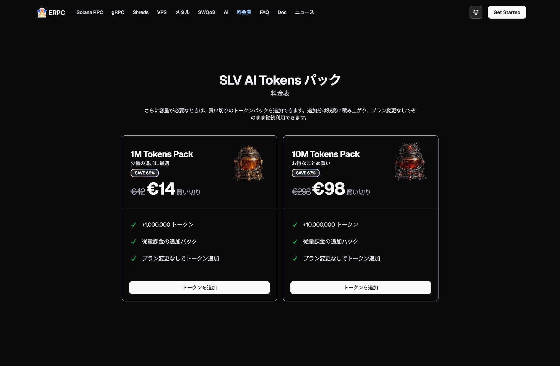 10M Tokens Pack(€98 買い切り) — +10,000,000 トークン。お得なまとめ買いの選択肢です。