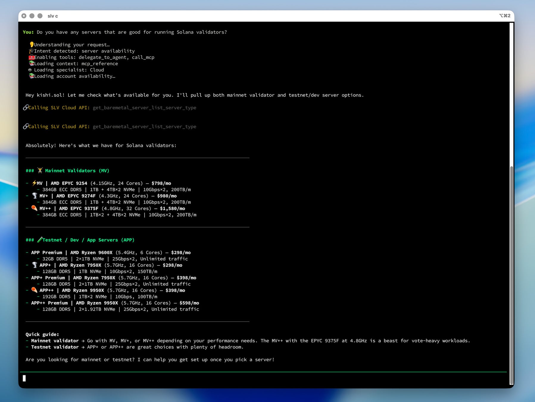 「Solana バリデータの運用に適したサーバーはある?」と尋ねれば、AI エージェントが必要な情報を読み込み、メインネットバリデータ向けのラインナップとテストネット・開発向けのラインナップを整理して提示します。サーバーの調達は SLV Metal の購入まで対応済みであり、選定から発注、構築までを同じ AI Console から進められます。
