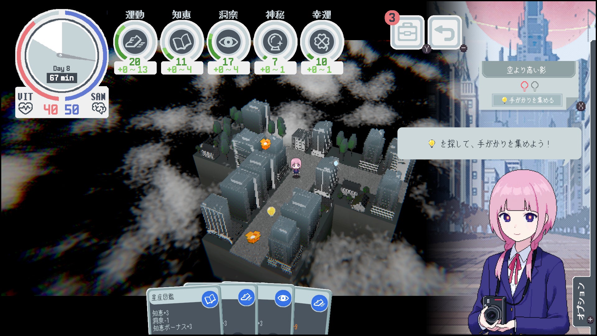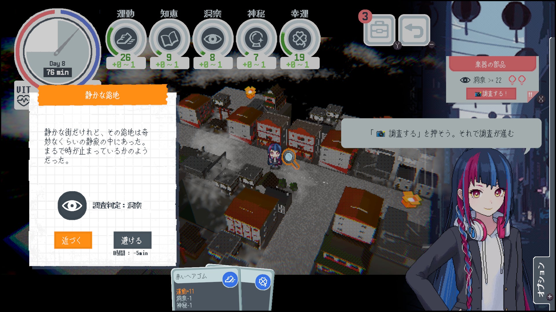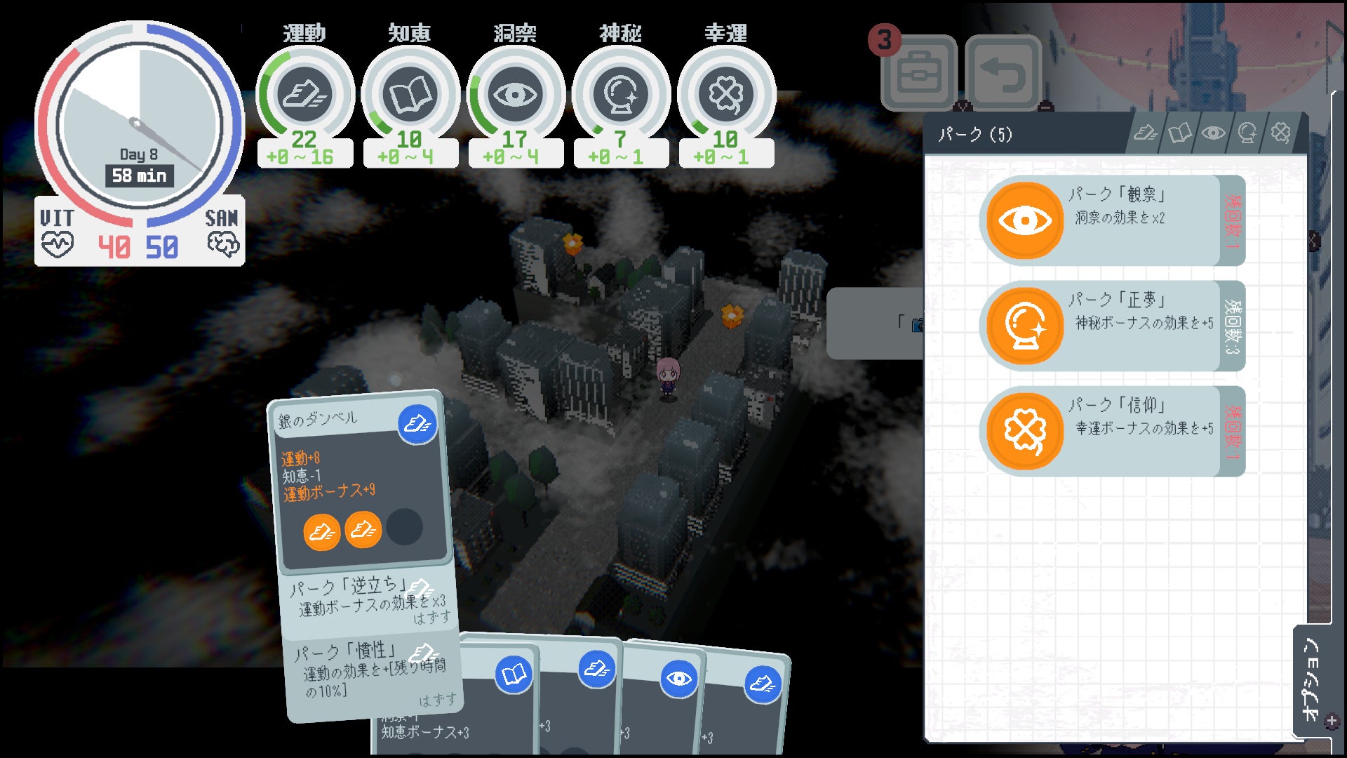 都市に散らばる「アイテム」でパラメータを強化し、さらに「パーク」を組み合わせることでアイテムの効果を高められます。限られた時間の中でアイテムやパークを集め、戦略的に調査判定を突破して謎を解き明かしましょう。