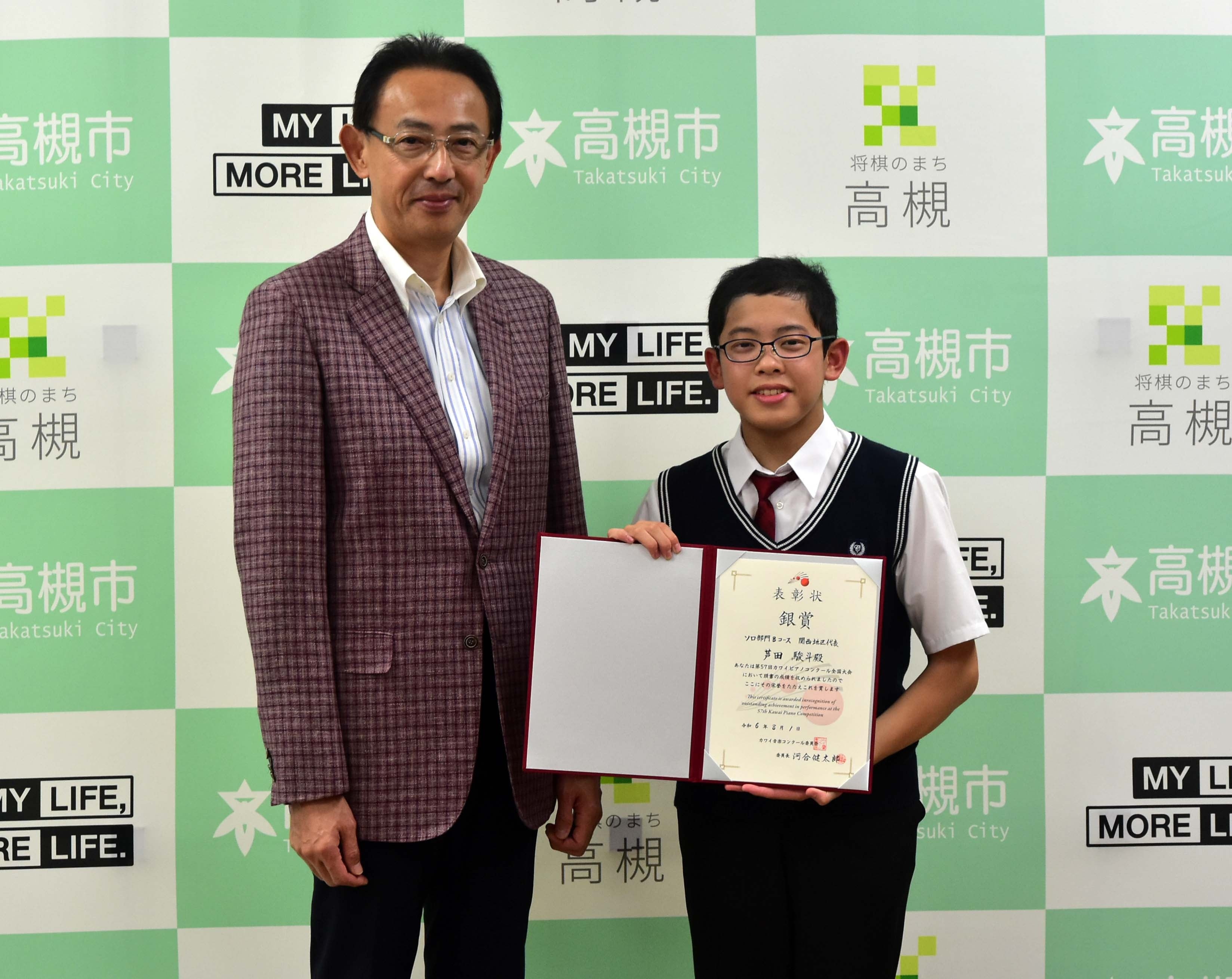令和6年9月6日(金曜日)、高槻市立第一中学校2年生の芦田駿斗さんが高槻市役所を訪問し、8月1日に神奈川県で開催された「第57回カワイピアノコンクール全国大会・ソロ部門」に出場し、銀賞を受賞したことを濱田剛史市長に報告しました。