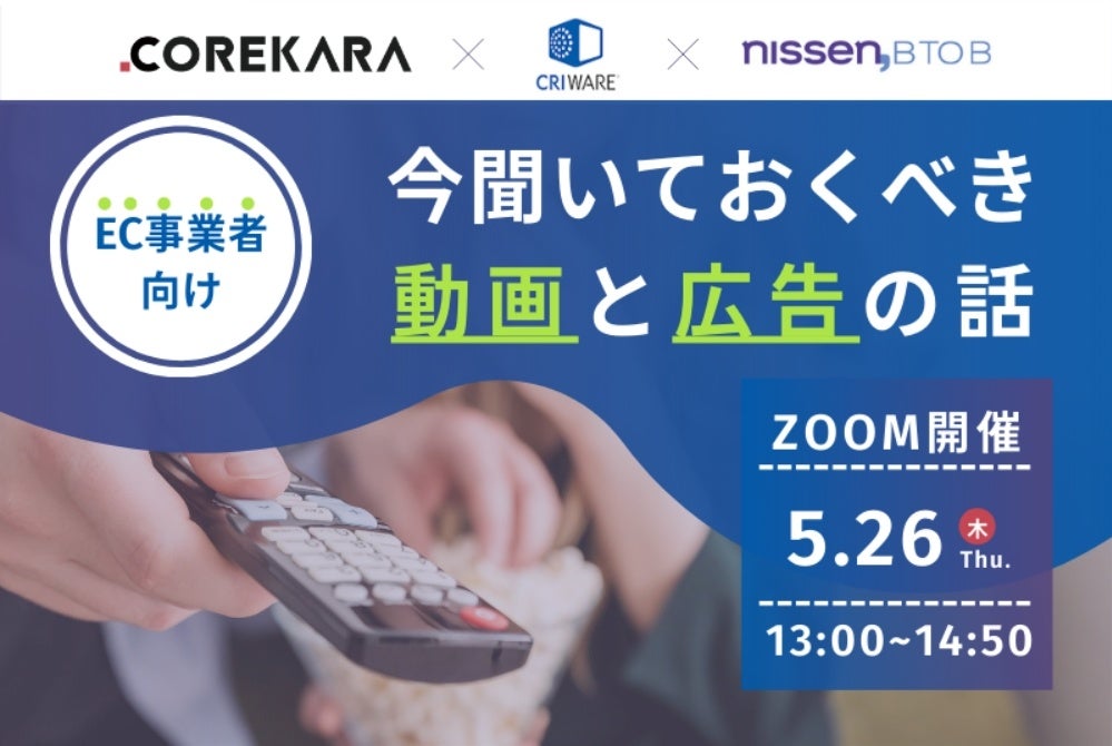 株式会社ニッセン(本社:京都市南区、代表取締役社長:羽渕淳)の通販支援事業部門「nissen,BtoB」は、2022年5月26日(木)13時00分より、EC・通販事業者向けに、株式会社これから(本社:東京都新宿区、代表取締役社長:今泉 雄介)、株式会社CRI・ミドルウェア(本社:東京都渋谷区、代表取締役社長:押見 正雄)との共催で、「今聞いておくべき動画と広告の話」と題したウェビナーを開催いたします。