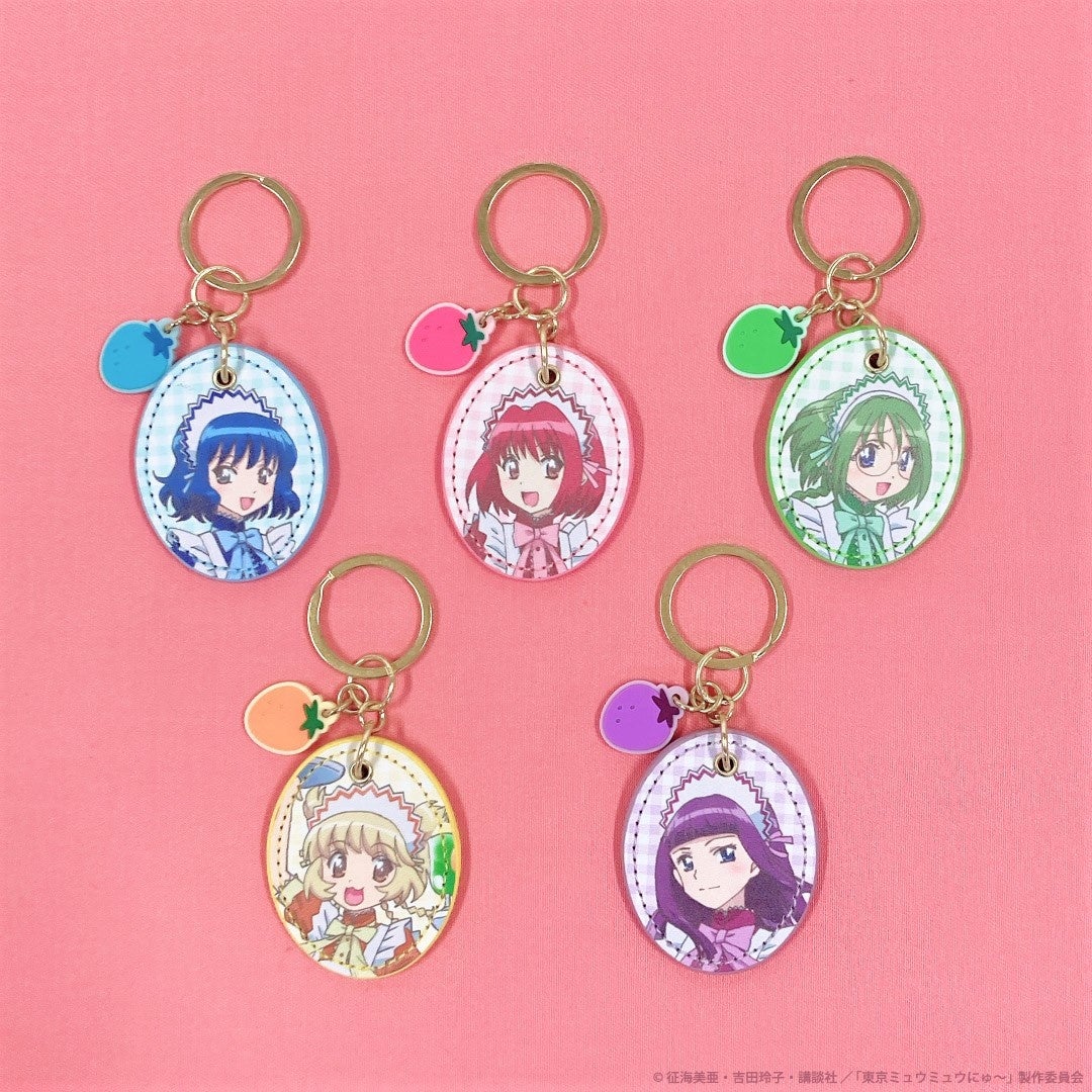 キャラクターカラーがキュートなレザー調キーリングやステッカー。キーリングは原作単行本表紙のデザインに使用されているいちごをモチーフにしたチャームがポイントで、裏面には変身アイテムもデザインされています。