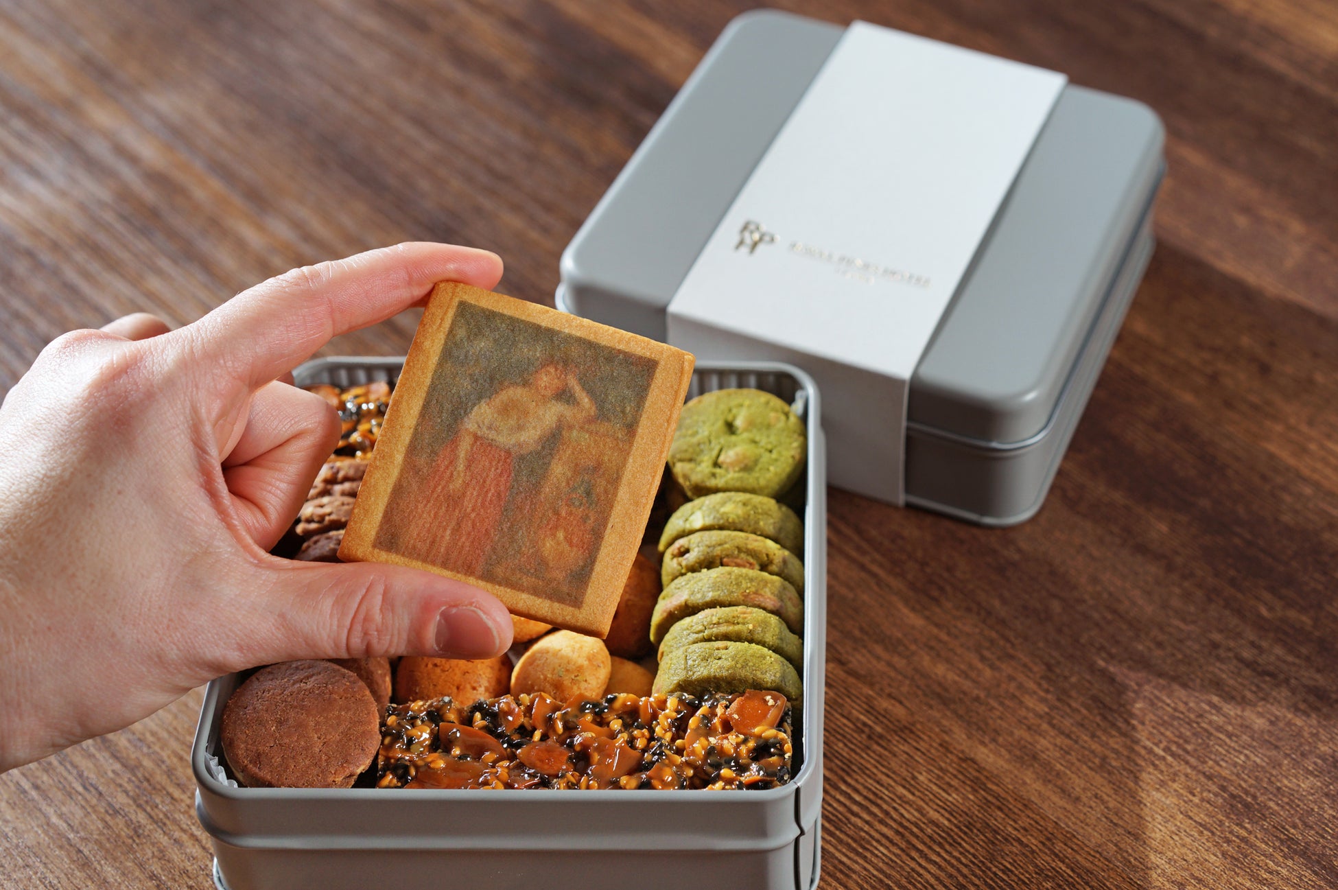 ホテルパティシエが作る、素材のハーモニーを楽しむ大人のクッキー缶にルノワールの《泉のそばの少女》をプリントしたクッキーをプラスした期間限定商品。