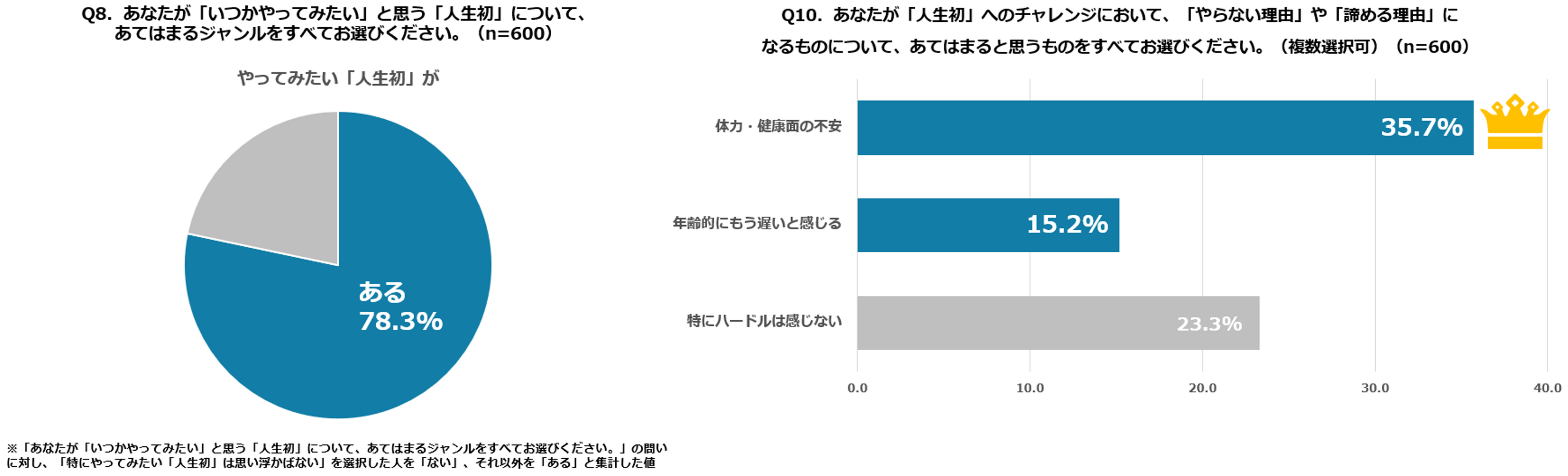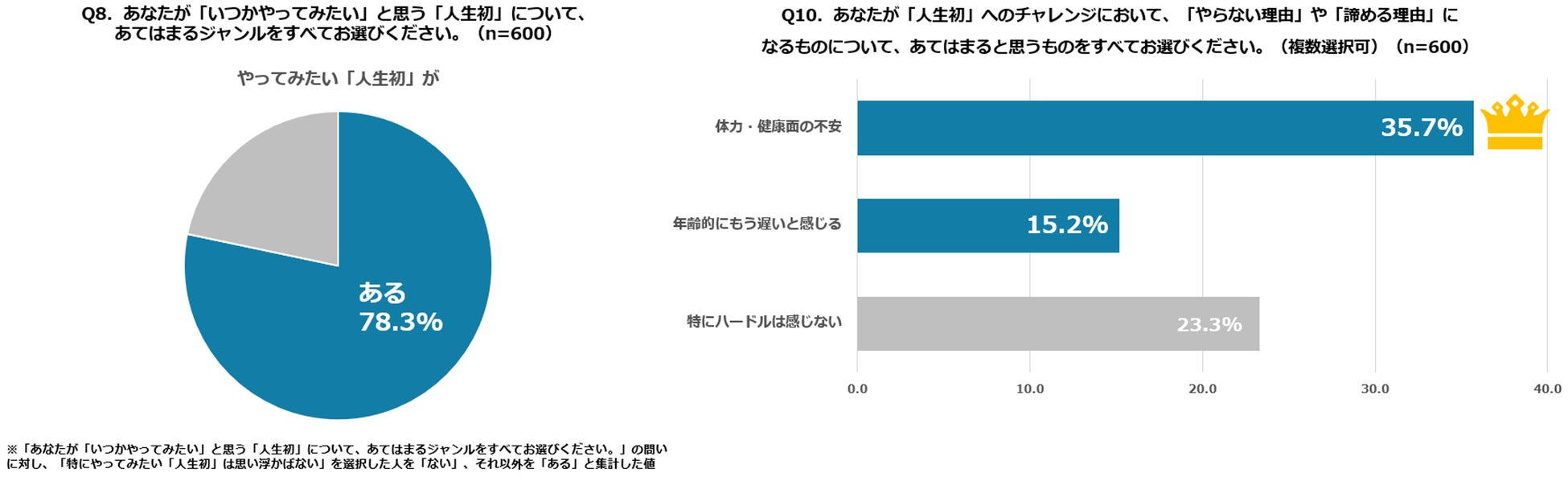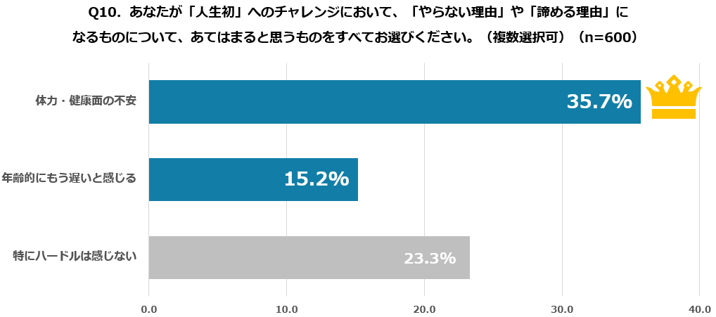 一方、挑戦を妨げるハードルを尋ねたところ、「体力・健康面の不安」が35.7%で最多となりました。また、「年齢的にもう遅い」(15.2%)も多く回答として挙げられ、体力と年齢を理由に人生初を断念する人が多くいました。