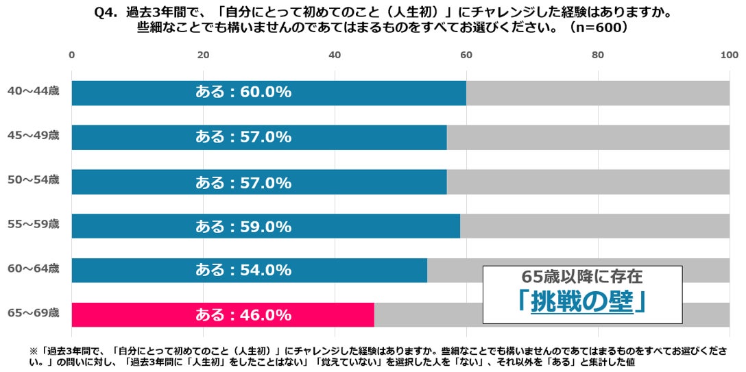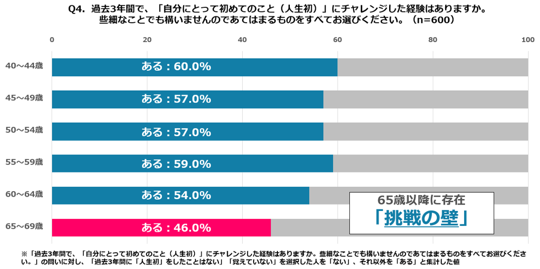 ⚫40代前半の「人生初」への挑戦経験率は60%と最も高く、50代も57~59%と高水準を維持