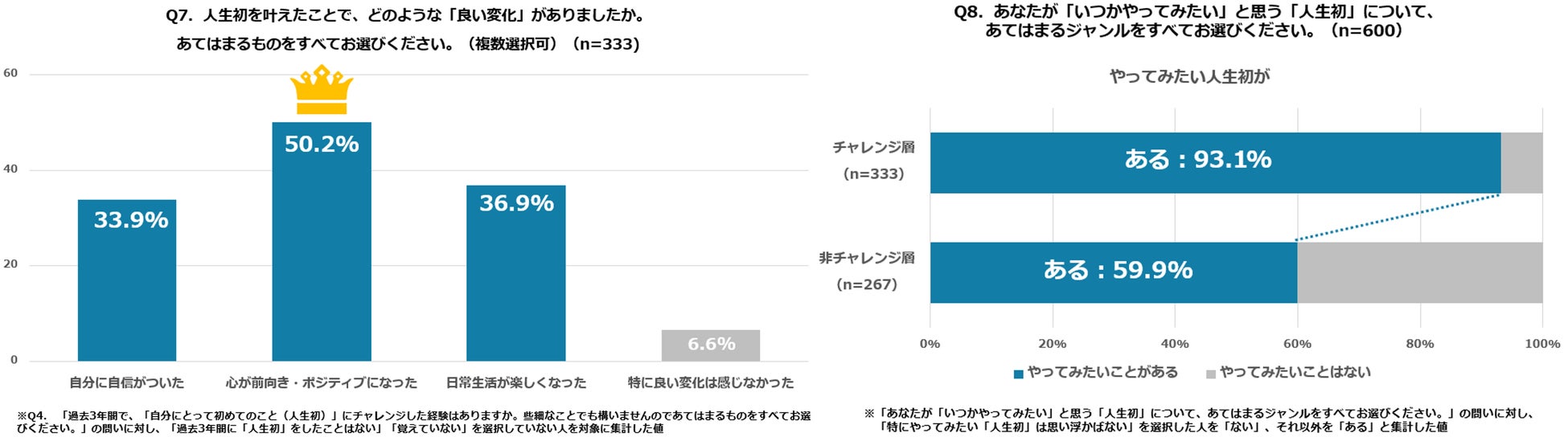 また、一度挑戦した人ほど、次の「人生初」にも意欲的になる傾向が見られたことも結果に表れています。つまり、「小さなきっかけで踏み出す→ポジティブな変化を実感→さらなる挑戦意欲が湧く」という前向きな年齢の重ね方への好循環が生まれている可能性があります。