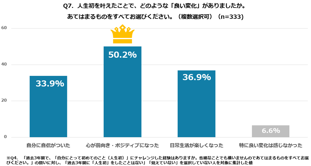 注目すべきは、挑戦がもたらす心身への好影響です。「人生初」に踏み出した人のうち、50.2%が「心が前向き・ポジティブになった」、36.9%が「日常生活が楽しくなった」と心身への影響を回答しています。