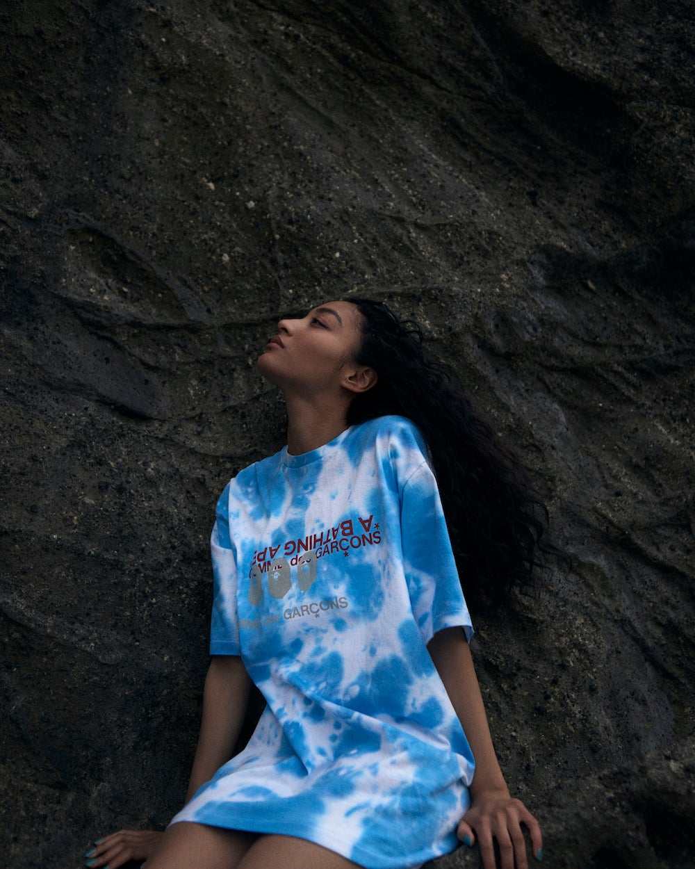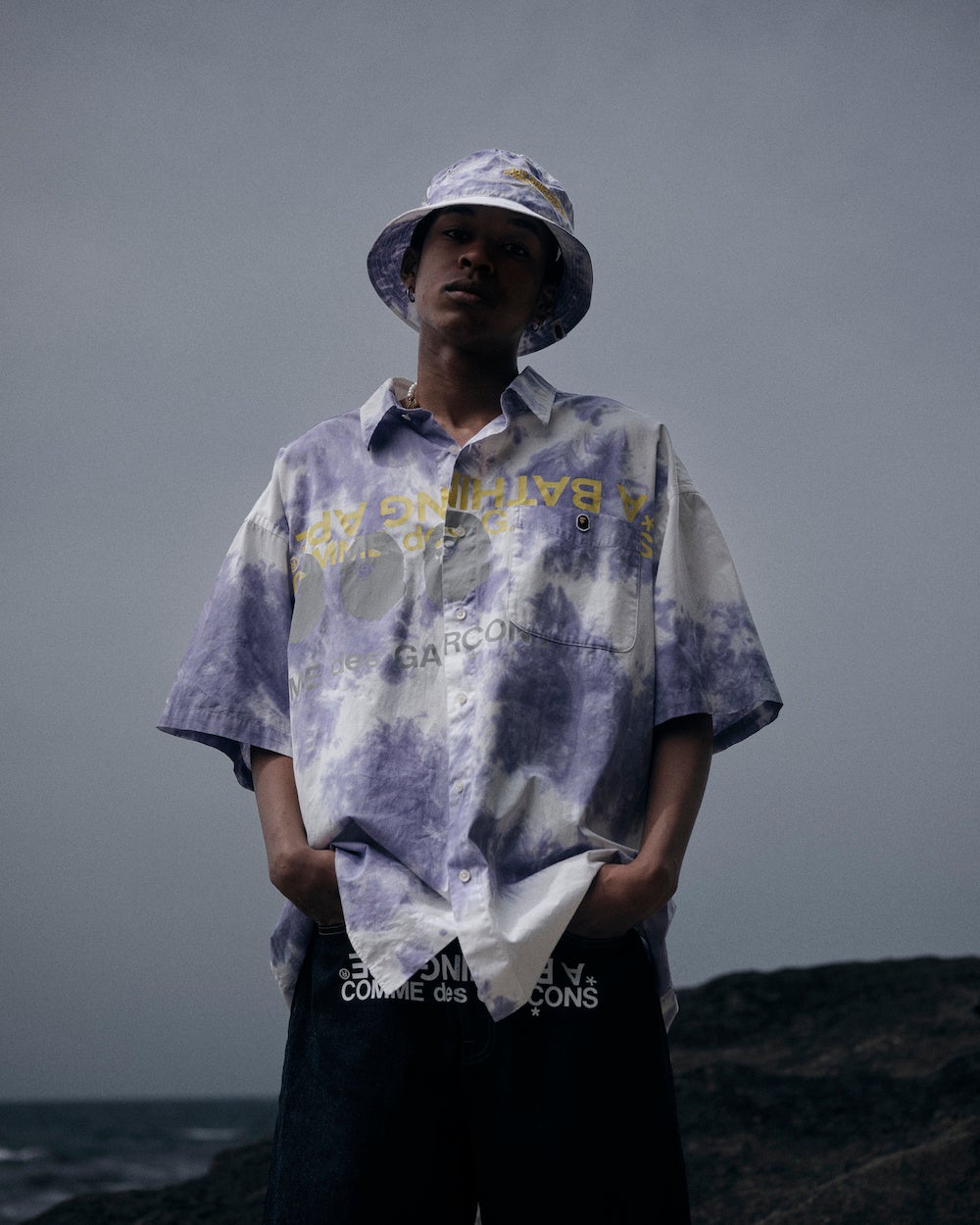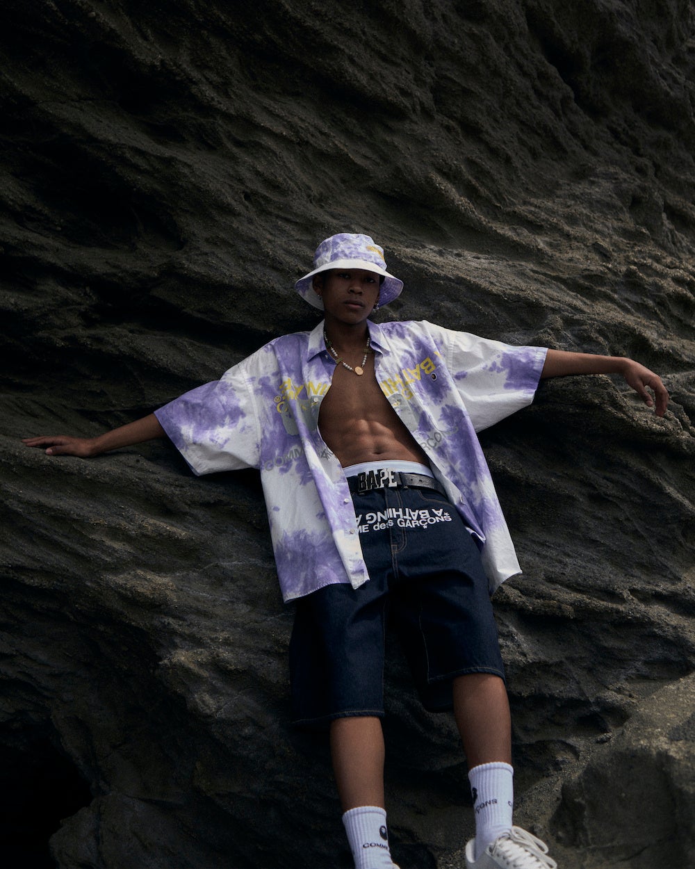 今シーズンは、タイダイ柄のトップスやデニムショーツなど、ストリートやヒップホップカルチャーに馴染みの深い「BAPE®︎」らしいアイテムを中心にラインナップ。それに連続した「APEHEAD」や「COMME des GARÇONS」のロゴをグラフィカルにあしらいました。