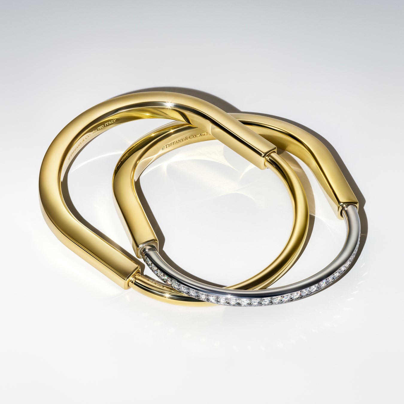 「ティファニー ロック」は、ティファニーのアーカイブに残る重要なモチーフであるパドロック(南京錠)から着想を得てデザインされ、人との絆や、その絆が自分をどのように伝えるのかを大胆に表現しています。“ルールはない。すべての人へ”という精神で作られたジェンダーレスなコレクション。バングルのクラスプ(留め具)は、パドロックの機能性を想起させる革新的な旋回式デザインを採用しています。