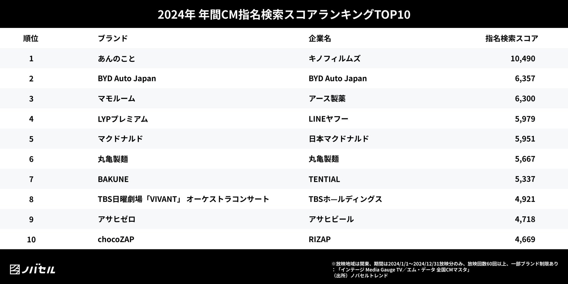 ソフトウェアとプロフェッショナル人材の力でマーケティングの民主化を目指すノバセル株式会社(本社:東京都品川区、代表取締役社長:田部正樹、以下ノバセル)は、テレビCM効果の分析サービス「ノバセル トレンド」を活用し、2024年に放映されたテレビCMの指名検索スコアランキングを発表いたします。
