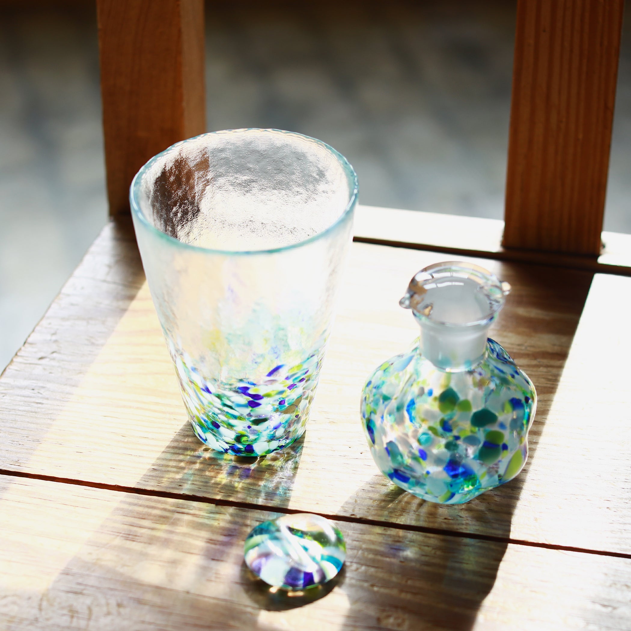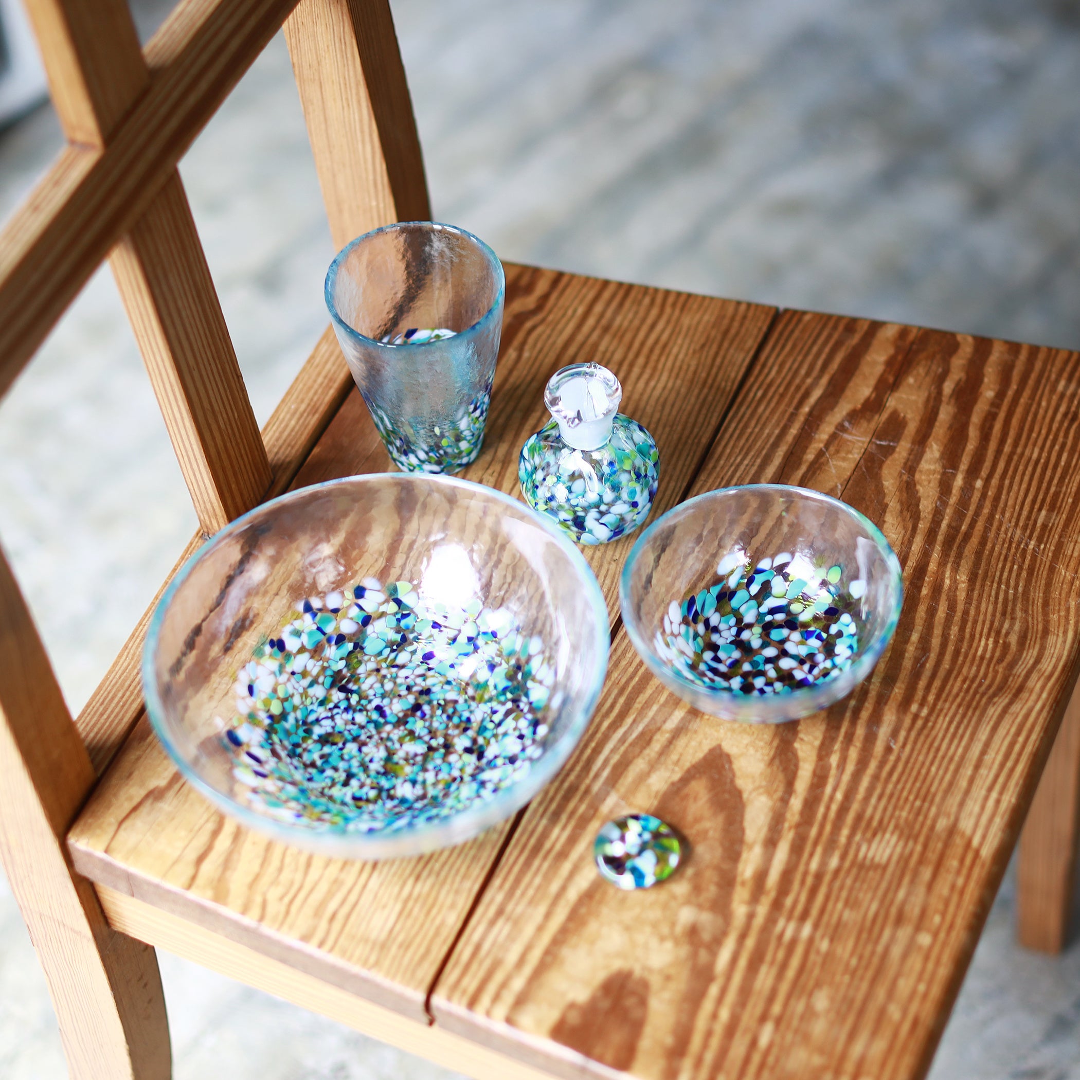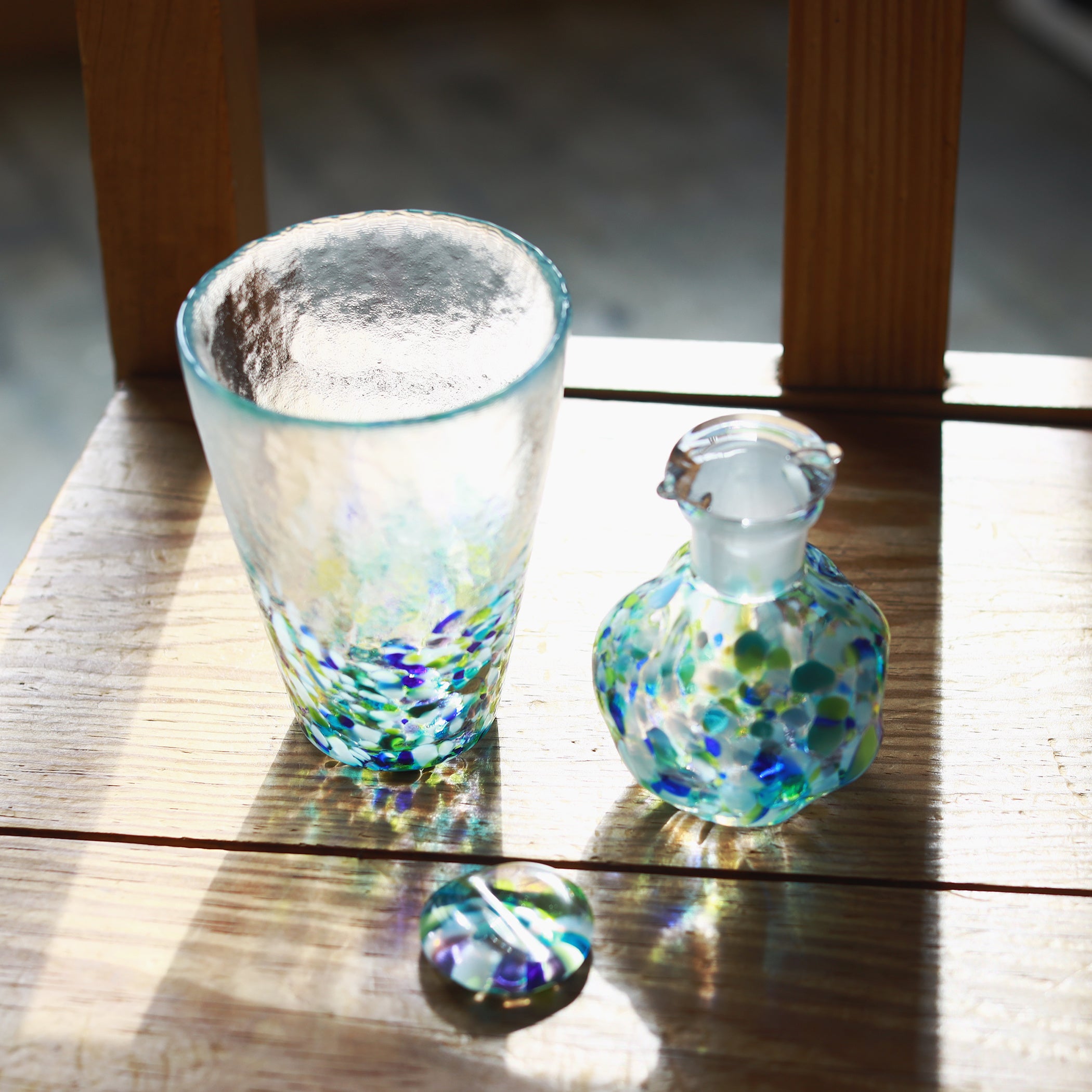 どちらも色ガラスで浮かび上がる模様は、爽やかな色ガラスが互いを引き立て合い夏の涼を演出し、青森の厳しい自然がはぐくんだ海や山を感じさせてくれます。