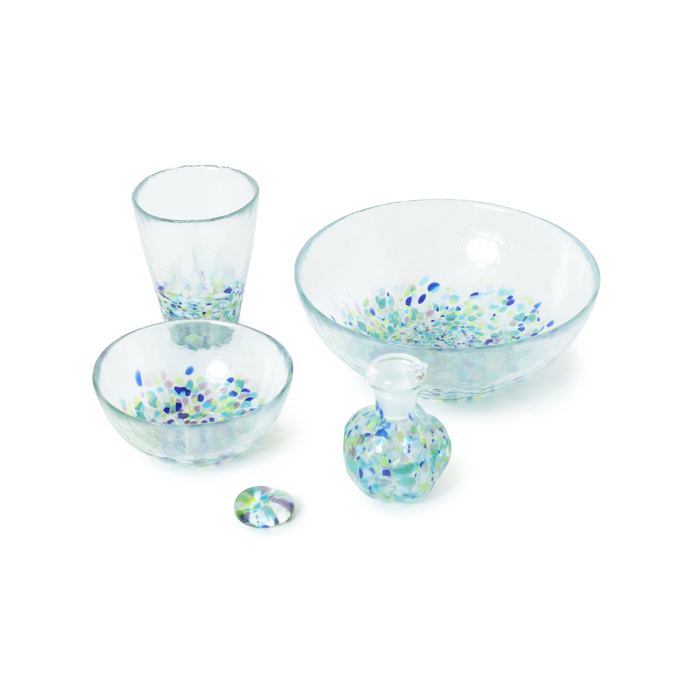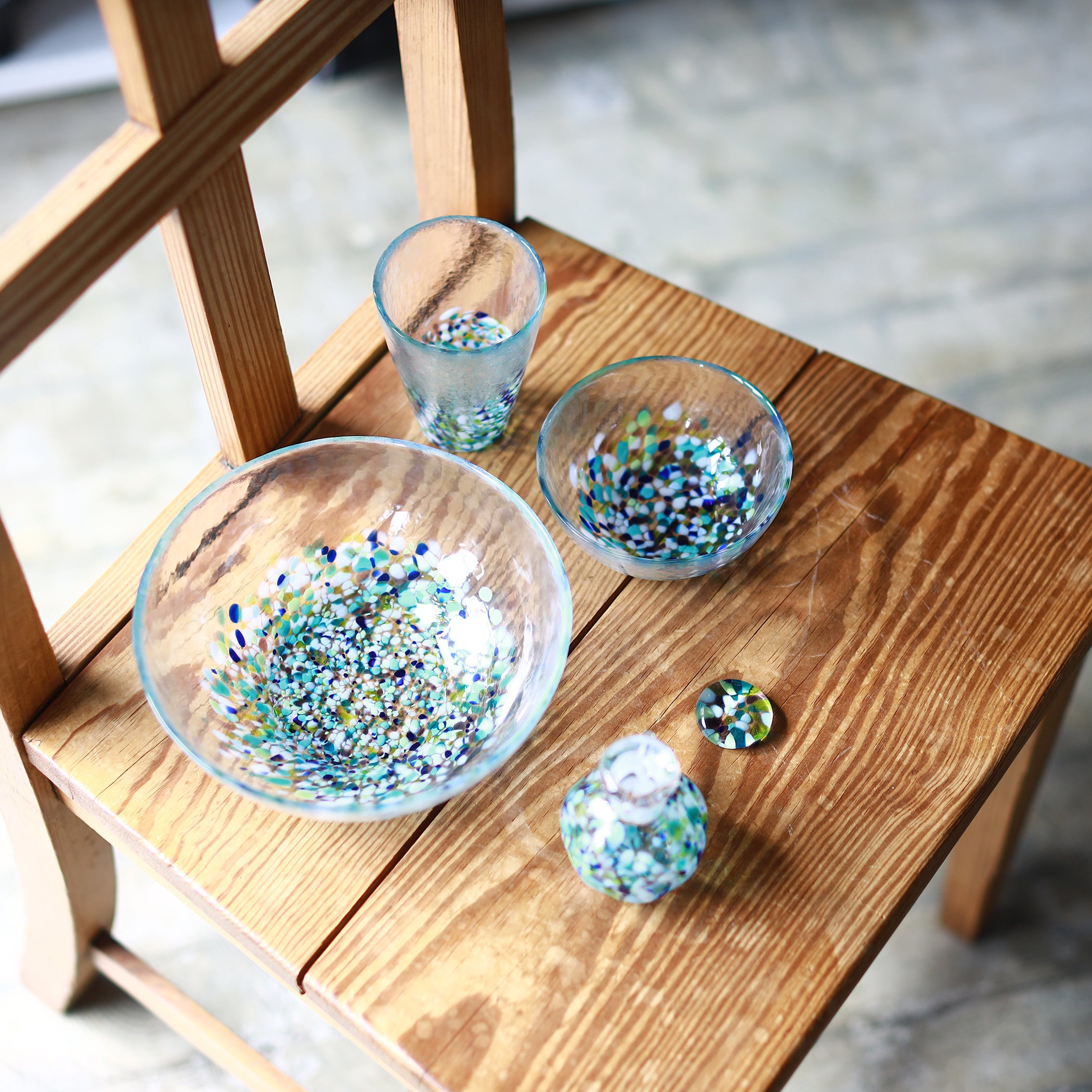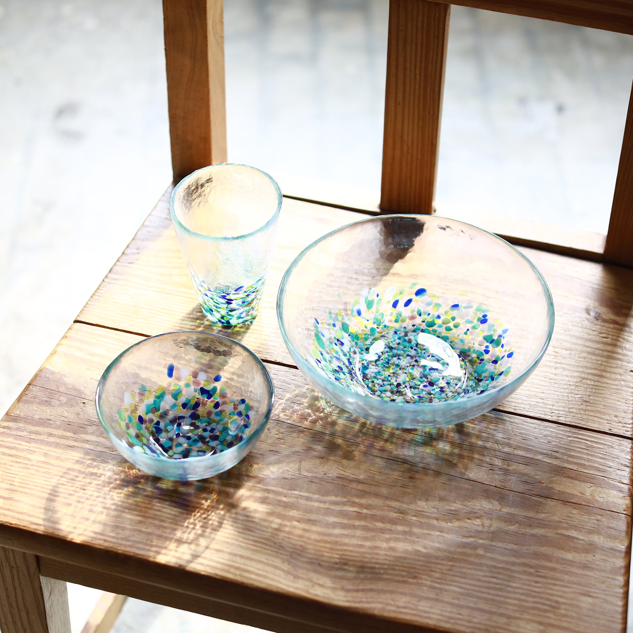 夏には冷やし中華やそうめん、酢の物などに使うのもおすすめ。色ガラスを通して光がパッと広がり視界から涼を感じられる、非常に美しいシリーズです。