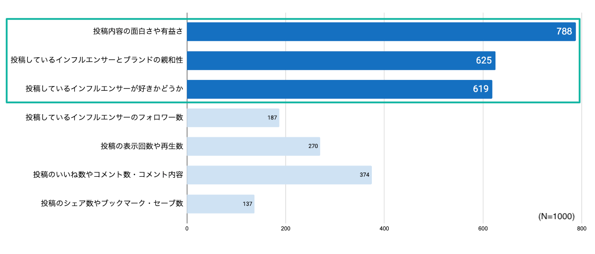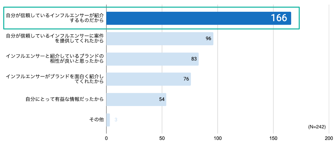 前項で信頼度が高まる・下がると回答した人それぞれに理由を質問したところ、信頼度が高まる理由の多くは「自分が信頼しているインフルエンサーが紹介するものだから」であった。インフルエンサーとファンの強固なつながりが、ブランドのファン形成に繋がるといえる。
