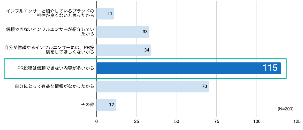 PR投稿の信頼度が高まる理由は「信頼しているインフルエンサーが紹介するものだから」、一方で下がる理由は「PR投稿は信頼できないものが多いから」