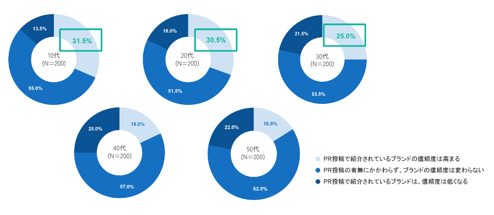 年代別でみると、どの世代でも「信頼度は変わらない」の回答が最多だったものの、10代・20代は「高まる」と回答した人が30%以上、30代は25%を超えており、若年層ほどPR投稿の情報を好意的に受け取っていると考えられる。