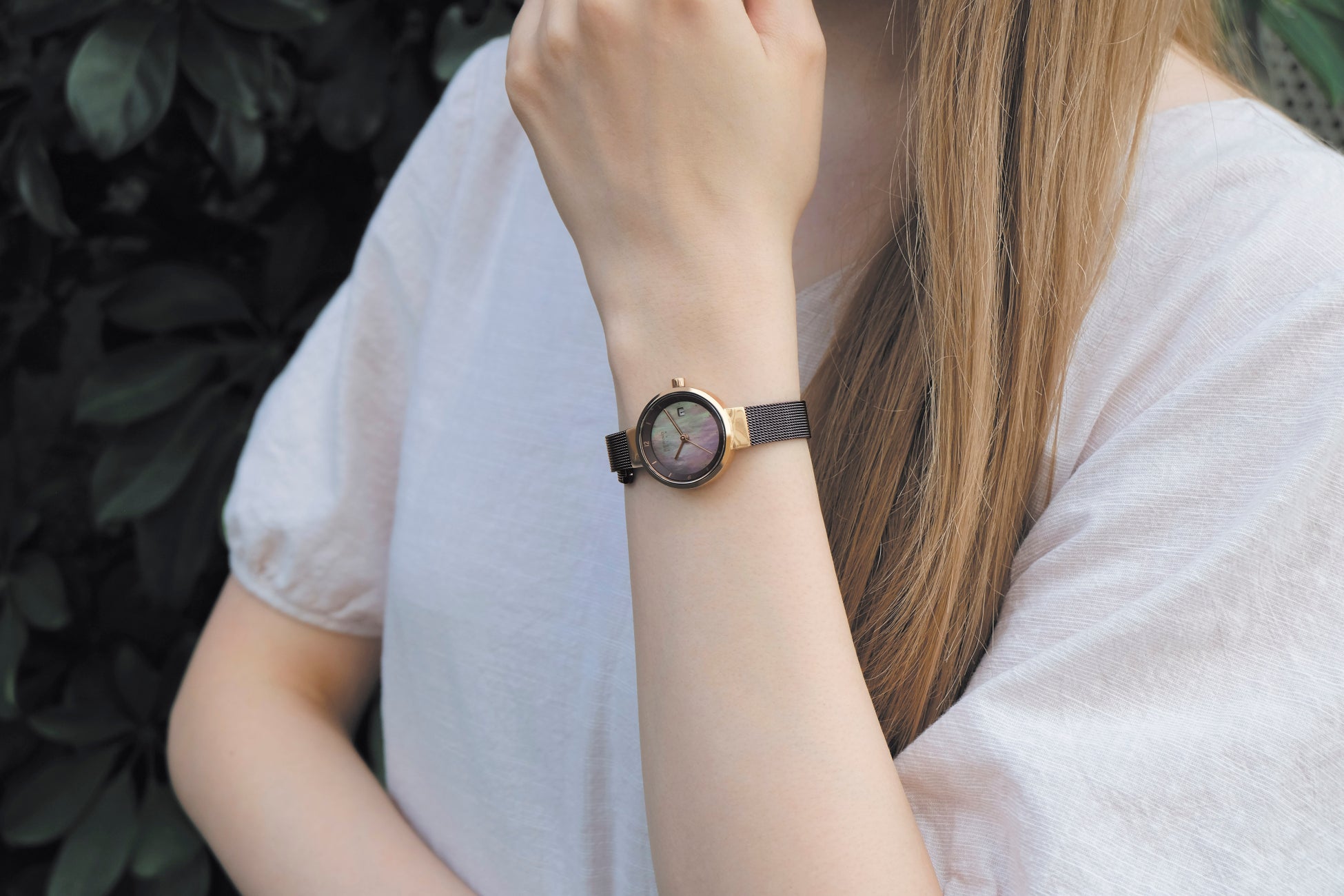 軽くて薄いソーラーウォッチは、直営店とTiCTACのみでの販売モデルで腕に優しくフィットし、細かいディテールと繊細なブラウンのメッシュストラップが特徴です。時代を超越した美しいケースは、磨かれたローズゴールドカラーのステンレススチール製です。硬く傷のつきにくいサファイアガラスの下には、ローズゴールドのインデックスと針を備えたブラウンカラーのマザーオブパールの⽂字盤がエレガントな1本です。