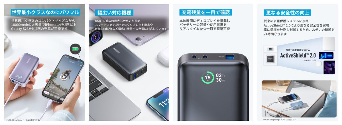 ※2 10000mAhかつUSB-Cポートを2つ備えた3ポート搭載のモバイルバッテリーにおいて、Anker調べ / 2023年4月時点